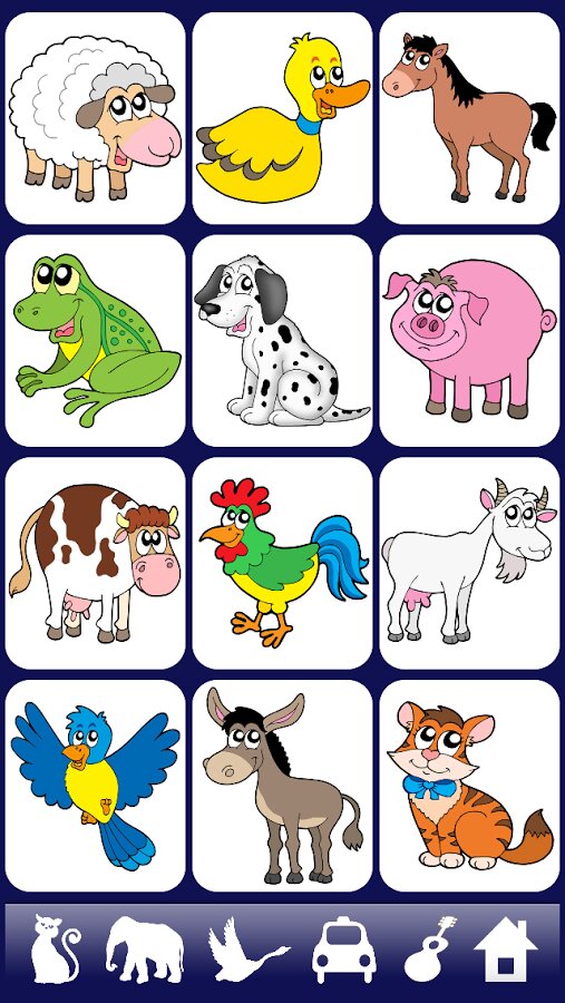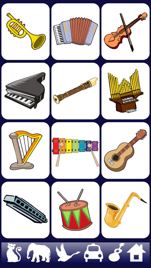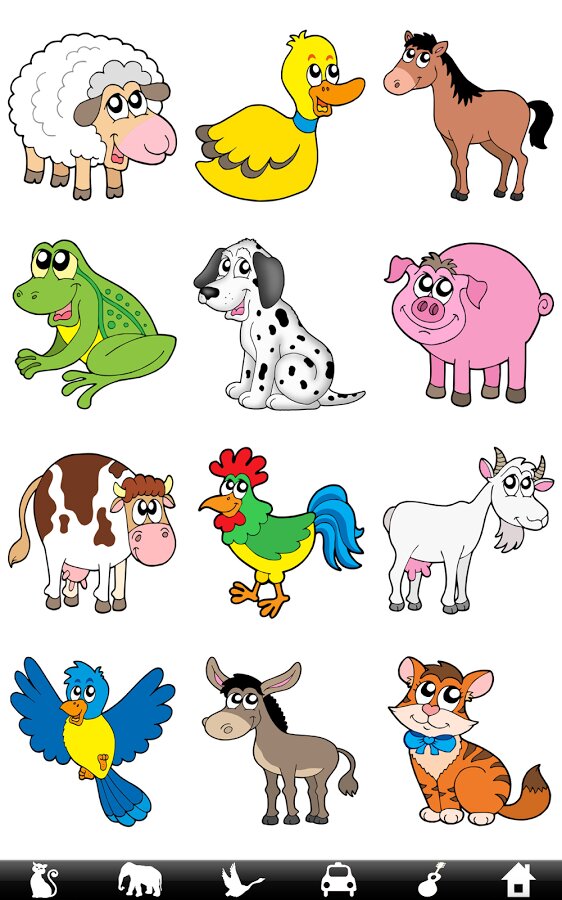 336 Звуков и изображений: животных, птиц, транспортных средств, музыкальных инструментов, домашних принадлежностей.