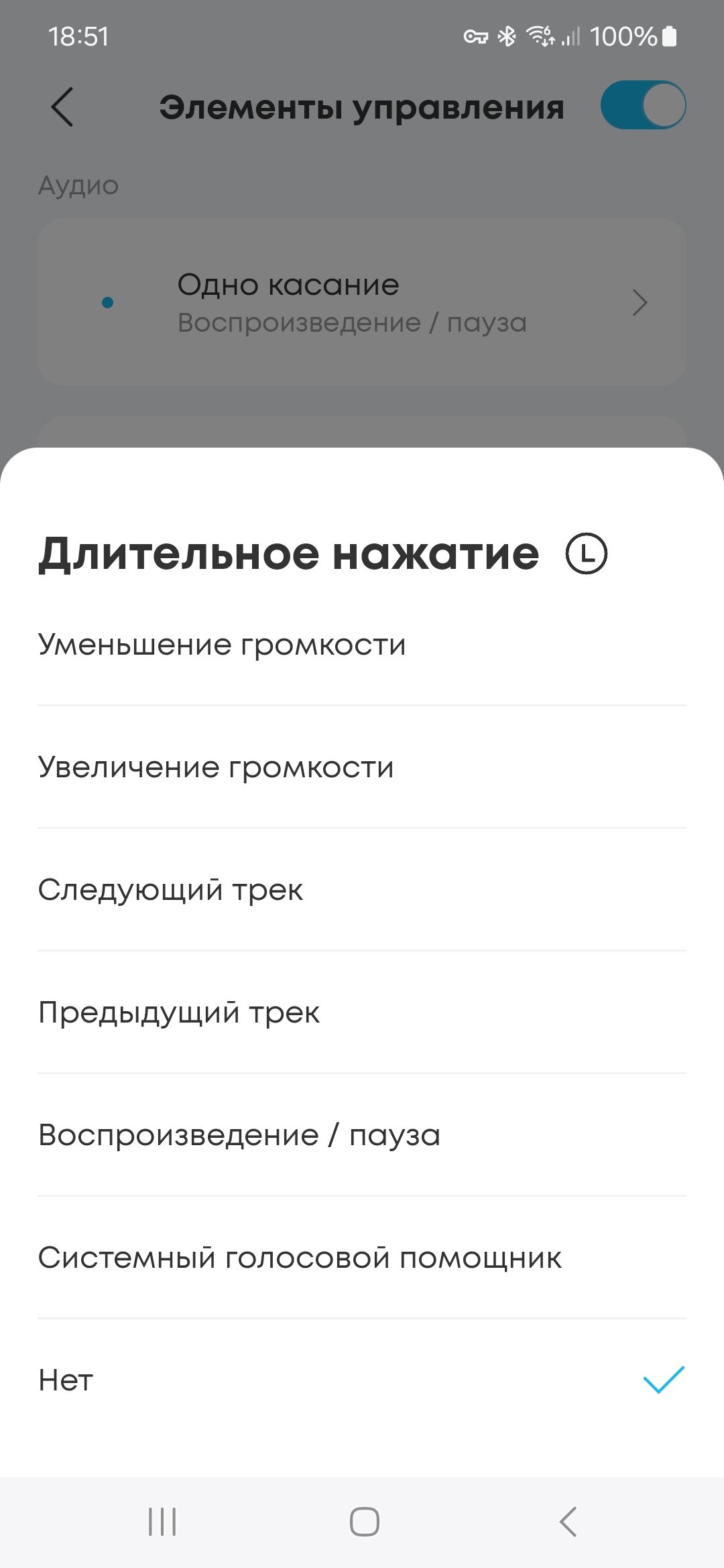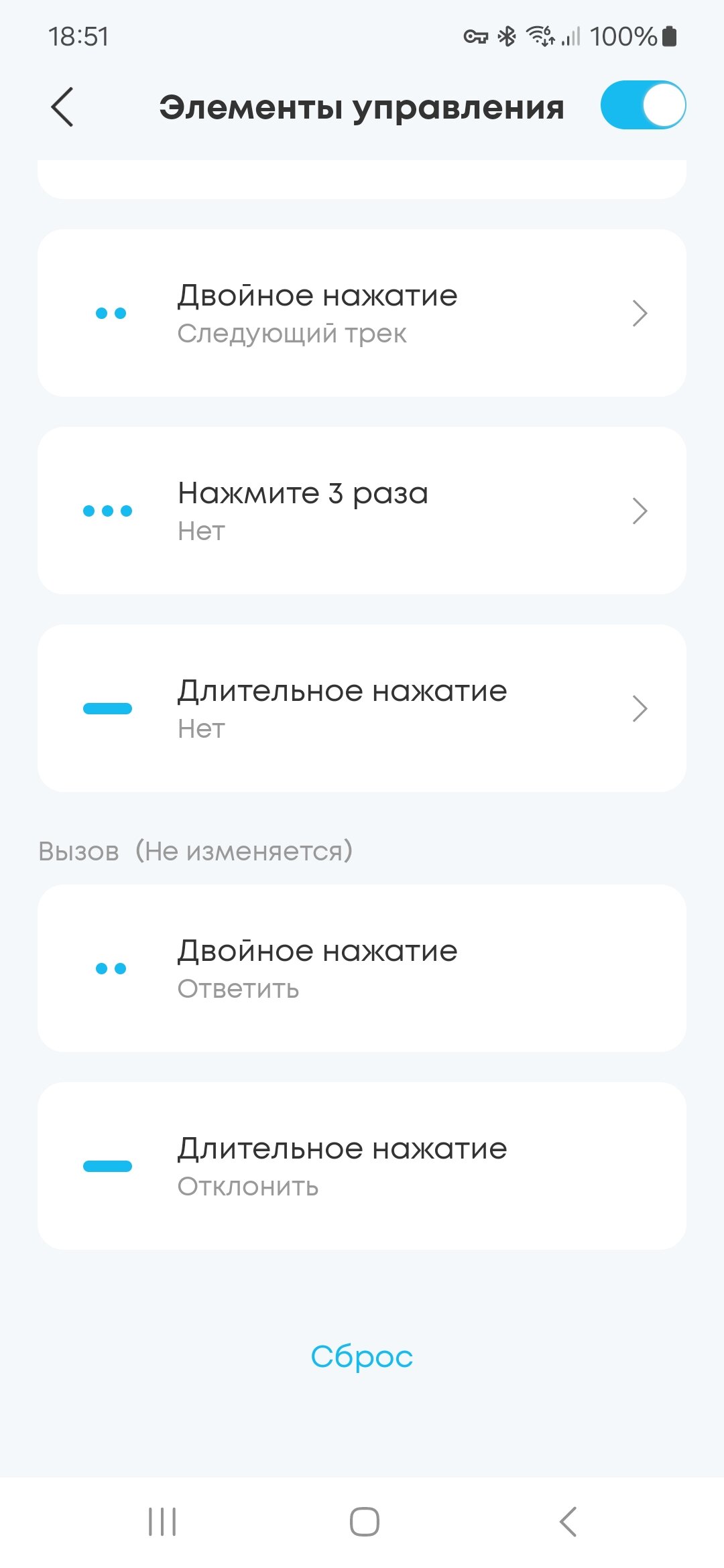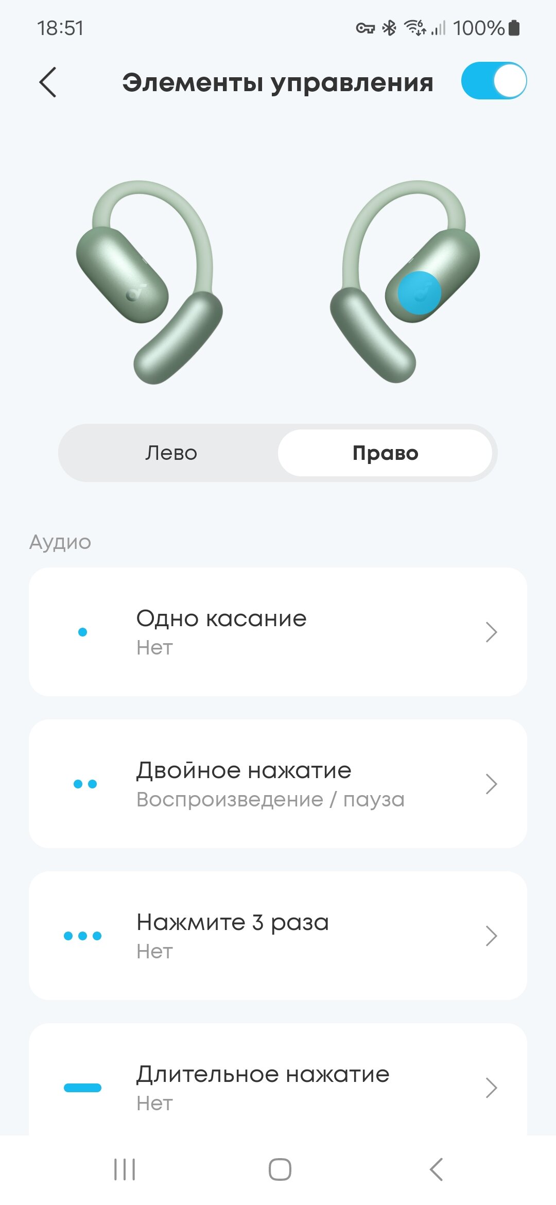 Сенсорные панели находятся в корпусах наушников. Настраиваются одинарные, двойные и тройные тапы, а также длительное удержание для каждого наушника. Разнообразие действий позволяет полностью управлять воспроизведением и громкостью без обращения к смартфону.