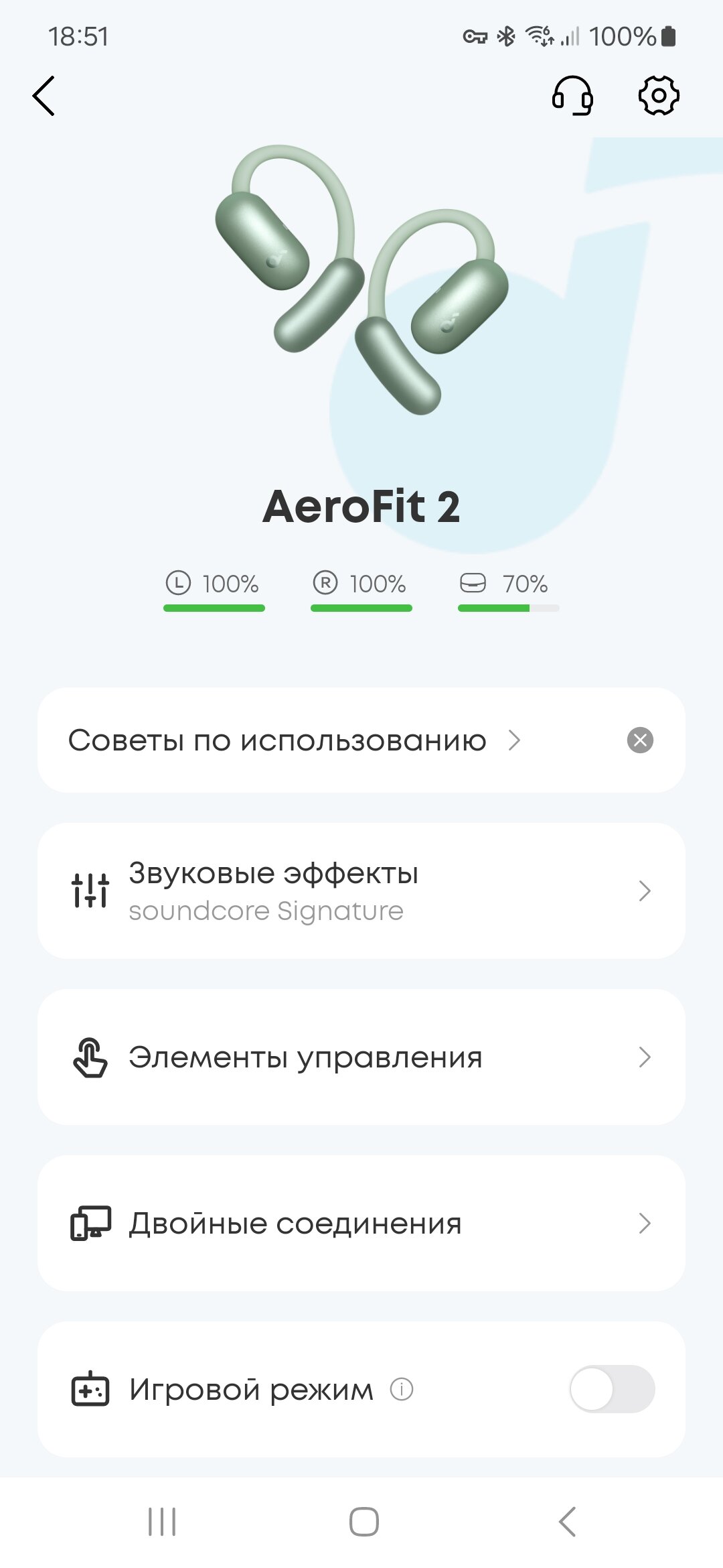 Наушники работают по Bluetooth 5.4, а в списке кодеков есть не только AAC с SBC, но и LDAC. Качество связи высокое, звук всегда синхронизирован с видео. Настроить звучание (эквалайзер, баланс), управление, игровой режим и предпочтительный кодек можно в приложении Soundcore. Также AeroFit 2 поддерживают одновременное подключение к двум устройствам.