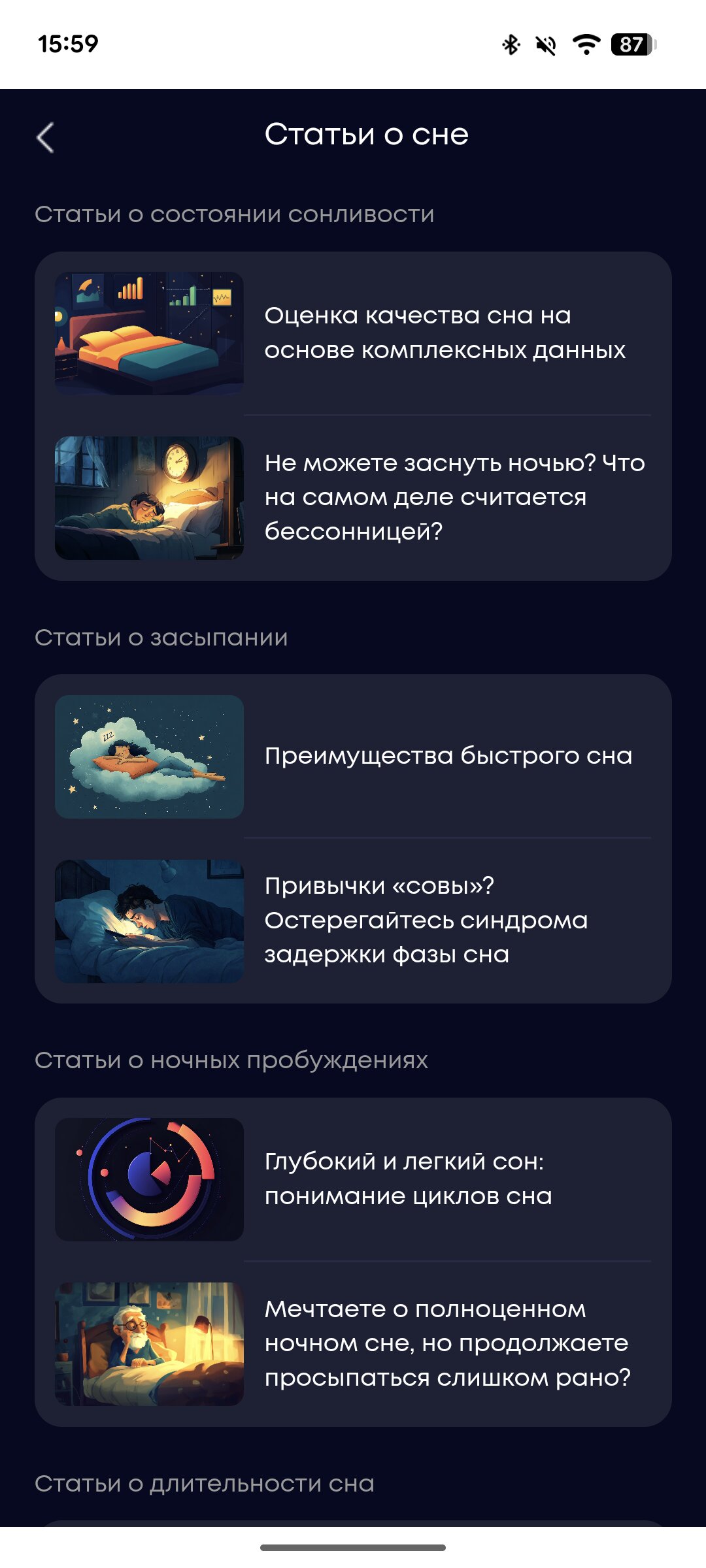 Более того, в приложении есть целый раздел с полезными статьями, посвящённый проблемам со сном. Здесь можно почитать о преимуществах быстрого сна, проблемах, связанных с «задержкой» сна, фазах сна и многом другом. Информация интересная — особенно если вы беспокоитесь о своём физическом и ментальном здоровье.