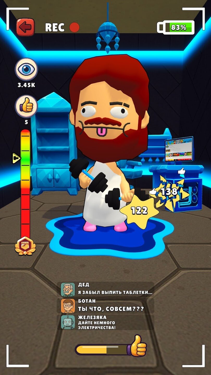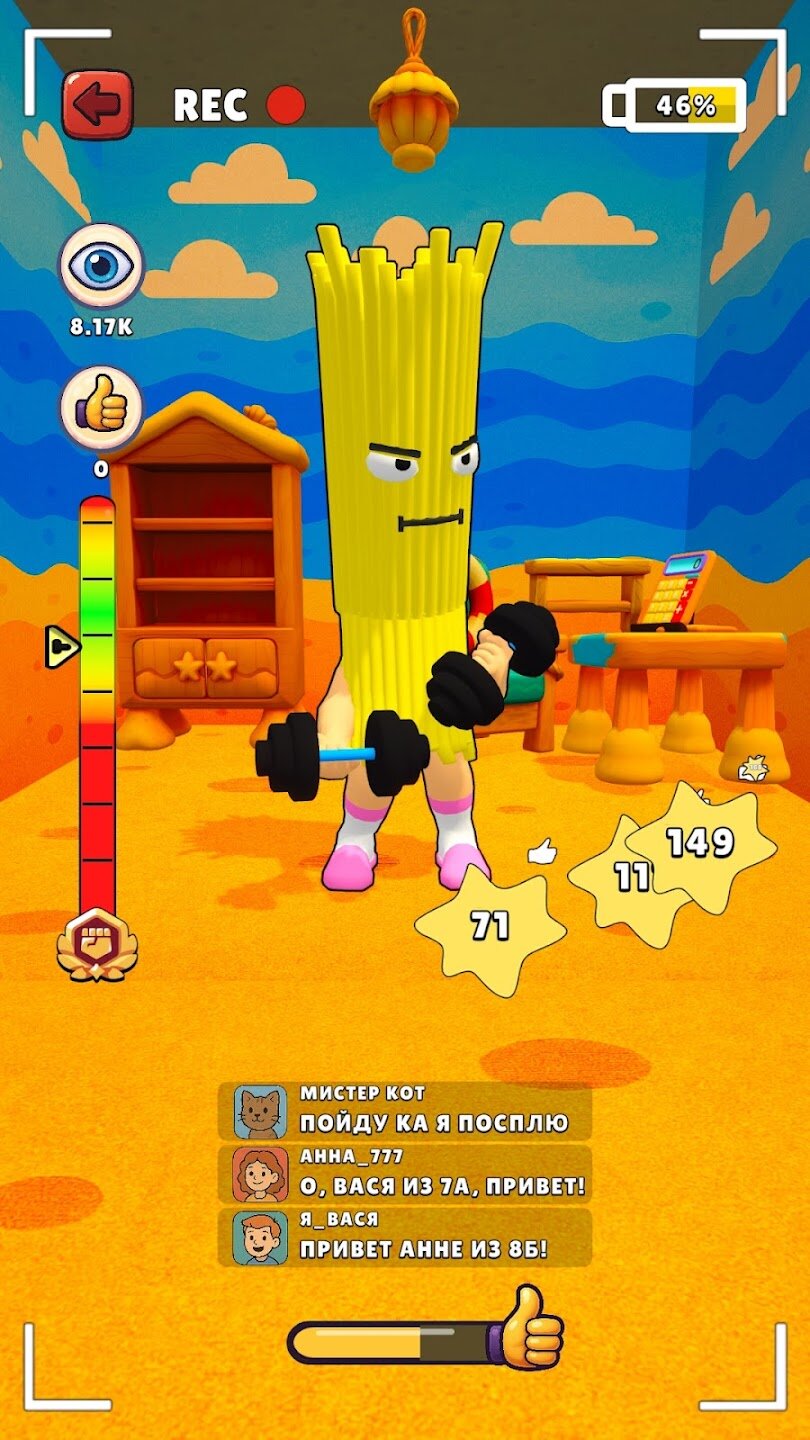 Игра про Спагетти 3D позволяет вам пройти безумный путь от неизвестного новичка до интернет-сенсации. Начните с того, что снимите на видео безумные челленджи по разбиванию спагетти и другие абсурдные трюки, чтобы привлечь первых зрителей. По мере роста вашего канала вы будете открывать новые локации, от обычной комнаты до студии в форме ананаса, и сотрудничать с известными российскими блогерами, такими как Holy Baam и Mikha Zen. Механика простоя гарантирует, что вы будете получать просмотры и лайки даже в автономном режиме, благодаря чему прогресс будет постоянным и приятным.