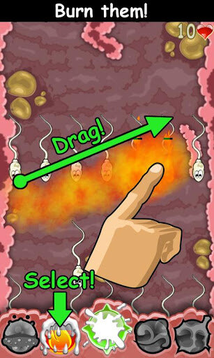 Sperm Defense — уничтожайте сперматозоиды, вирусы и бактерии, тапая по ним пальцем, поливая кислотой, сжигая электрическим током и огнем. На каждом из ста этапов этой аркадной игры для Android постарайтесь не пропустить более десяти врагов. Постепенно вы сможете улучшать ваше оружие, увеличивая его силу, время работы, скорость восстановления и другие параметры.