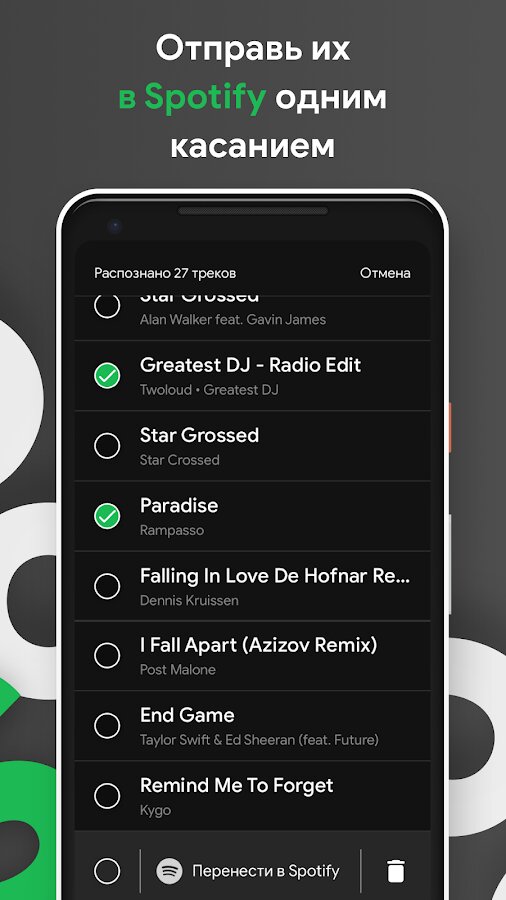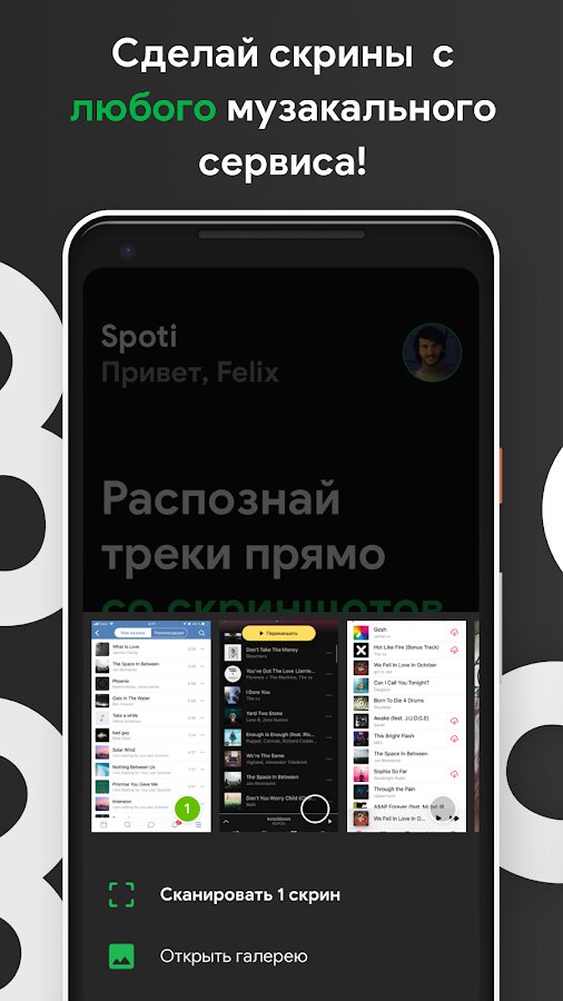 SpotiApp — приложение для переноса музыкальной библиотеки из различных сервисов в Spotify. Принцип работы приложения достаточно уникален — вам просто нужно делать скриншоты своей библиотеки в сервисе из которого вы хотите перенести музыку. Приложение автоматически распознает названия треков на скриншотах и проведет экспорт музыки в Спотифай. Такой подход позволяет обезопасить ваш аккаунт, поскольку он не требует ввода пароля от вашего Google или других аккаунтов, и не требует подключения сторонних приложений.