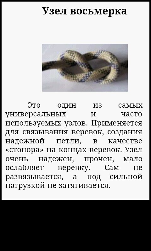 Краткий офф-лайн справочник основных узлов, применяемых в туризме, альпинизме рыбалке и яхтинге. Показаны способы завязывания каждого узла, характеристики и область применения.