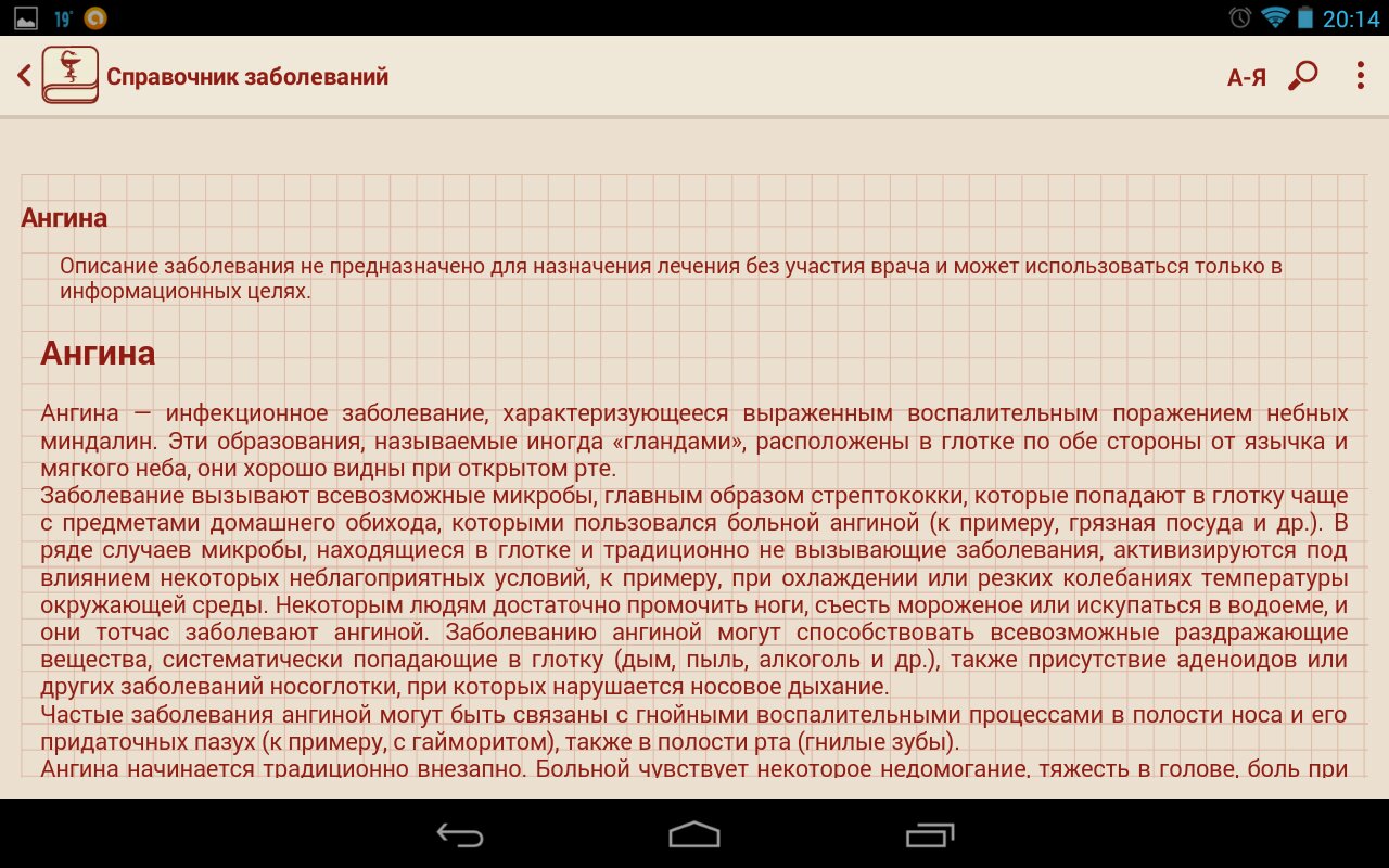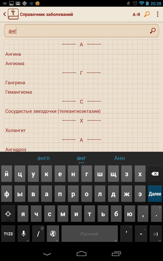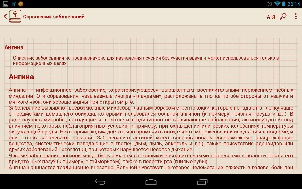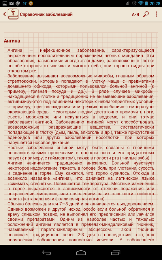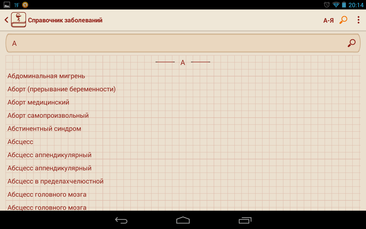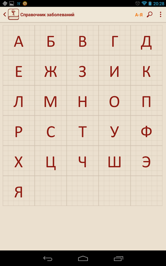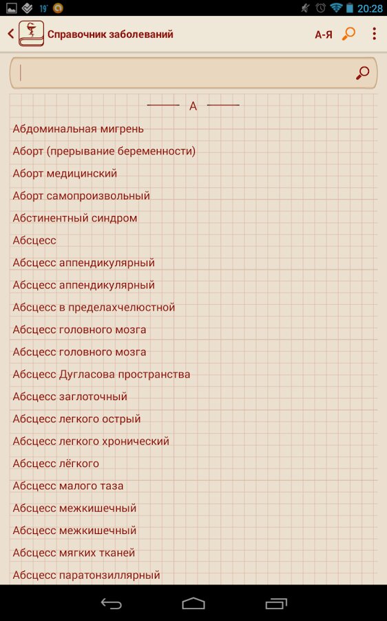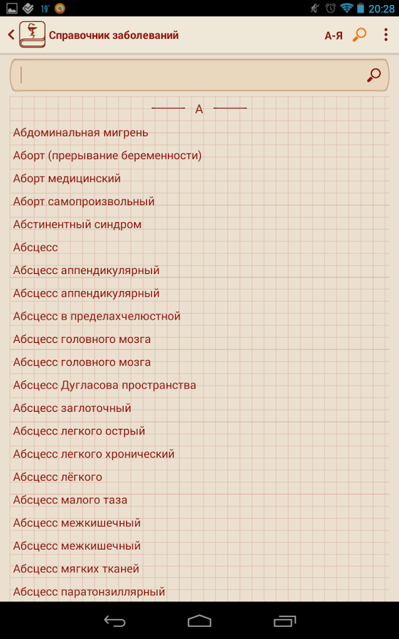 Данное приложение пригодится всем заботящимся о своём здоровье, а также студентам и специалистам в области медицины. В приложении все заболевания разбиты по буквам, что позволяет получить удобный доступ к необходимому заболеванию. В приложении реализован удобный поиск, который позволит найти интересующую вас информацию в кратчайшие сроки.