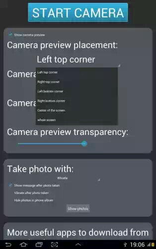 Шпионская Камера HD — отличное, полезное приложение для андроид устройств с помощью которого вы сможете создавать фотографии как настоящий шпион. Во время съемки установите прозрачность экрана съемки на минимум. Люди будут думать, что вы играете игры или просто сидите в интернете. Кроме того, когда вы фотографируете — приложение не создает никаких звуков, вы с легкостью сможете делать фотографии в любых местах! Скачайте программу на свой планшет или смартфон и пользуйтесь на здоровье!:)