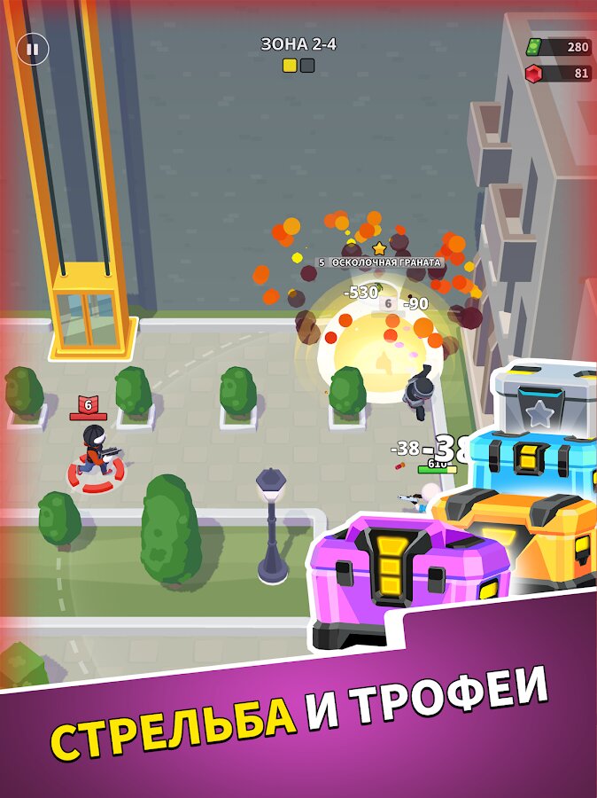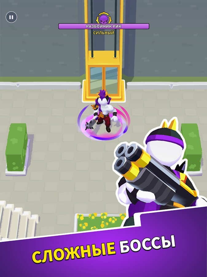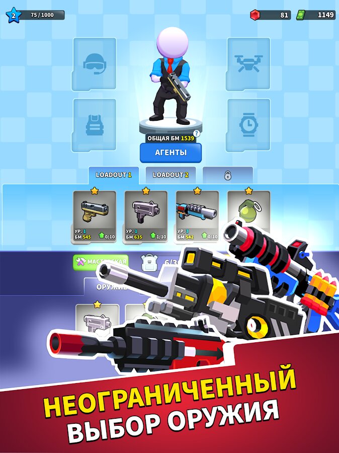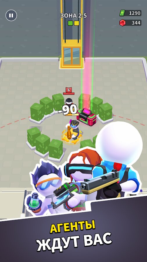 - Стрелять никогда не наскучит — в игре более 200 уникальных уровней, каждый из которых требует своего тактического подхода и продуманной стратегии. Кроме того, вас ждут около 20 различных боссов. Бои с ними будут непростыми, зато за победу вы получите потрясающие награды для ваших 🕵️♂️ элитных агентов.
