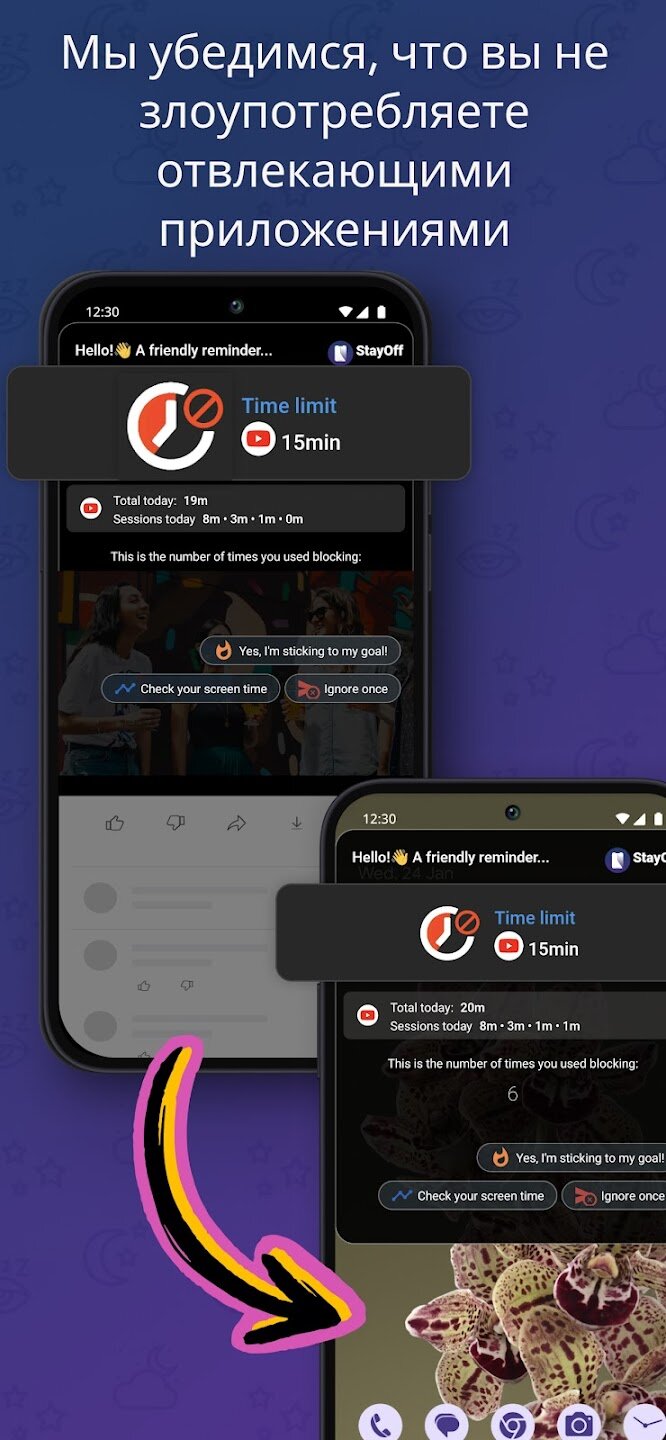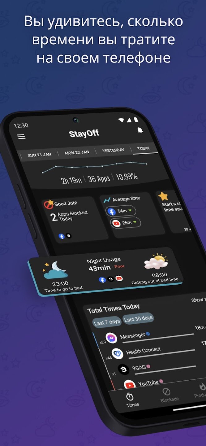 StayOff – это умное приложение для контроля экранного времени, которое помогает отслеживать активность смартфона, анализировать использование приложений и снижать цифровую зависимость.