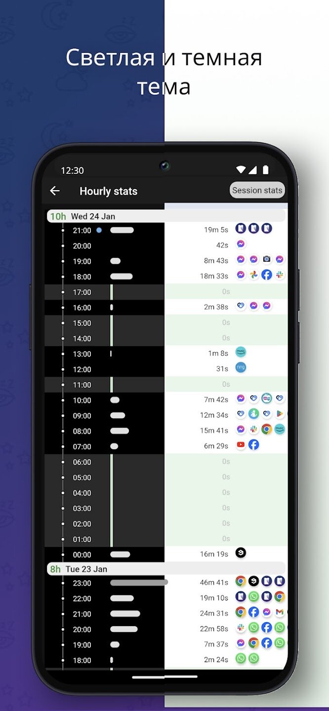 Приложение мотивирует на изменение поведения: устанавливайте лимиты для соцсетей или игр, получайте уведомления при приближении к лимиту и сравнивайте свои показатели с рекомендованными нормами. Бонус — анализ «худшего дня» и самых ресурсоемких приложений.