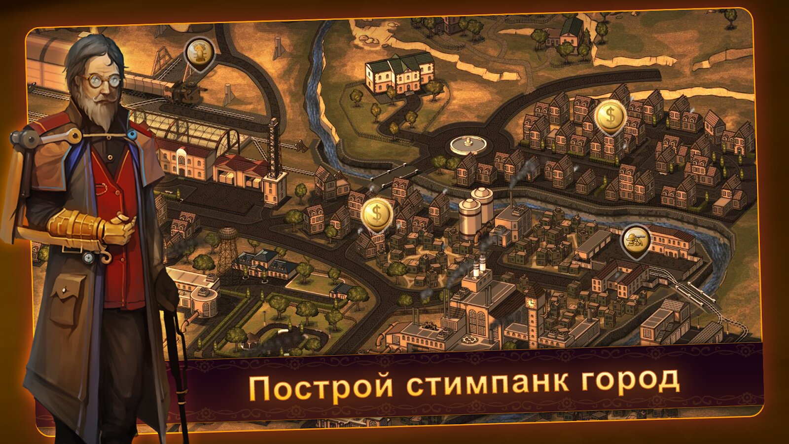 - Секретный стимпанк город! Стройте научно-исследовательские лаборатории, склады и заводы для постройки новых пушек.
