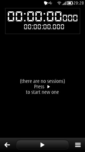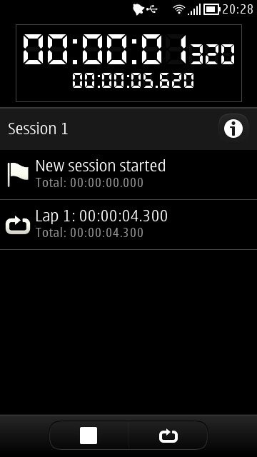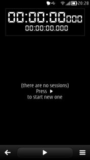 Stopwatch — является продвинутым секундомером, который будет всегда у Вас под рукой для повседневного использования прямо в Вашем смартфоне Nokia. На рабочем экране программы отображается общее время работы и промежуточное время замеров, Вы имеете возможность выбора какое время для вас приоритетное и должно быть показано в качестве основной информации. При нажатии значка Сессия, Вы узнаете число замеров, выполненных в течении сессии, и получите доступ к своим статистическим данным. Данные сессии представляют все события, которые произошли во время сеанса измерений, в зависимости от настроек пользователя может видеть общее время сессии, индивидуальное время замеров и разницу между текущим и предыдущим замером. Поддерживается работа приложения как в портретной так и в ландшафтной ориентации.