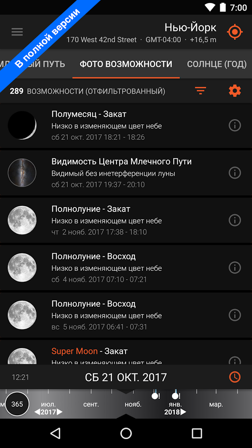 - Режим карты — вид местности сверху с наложением событий и позиций Луны и Солнца на интерактивную карту. Фиксируйте вашу точку наблюдения и согласуйте съемку с лунными и солнечными событиями!