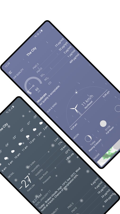 - Качество воздуха, УФ-индекс, влажность, видимость, точка росы, атмосферное давление, скорость и направление ветра.