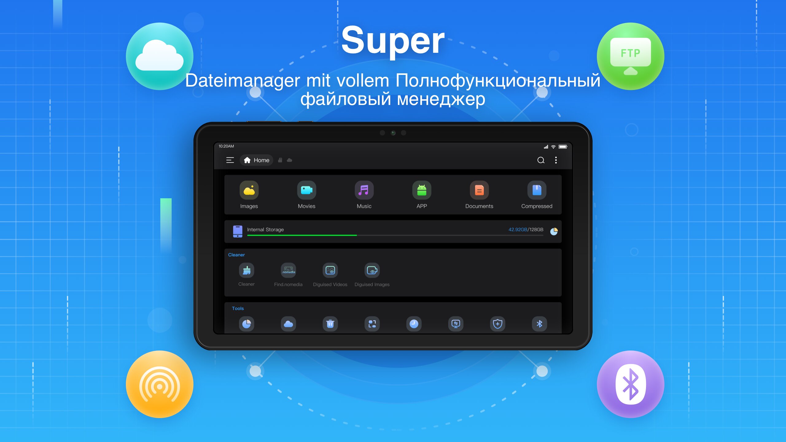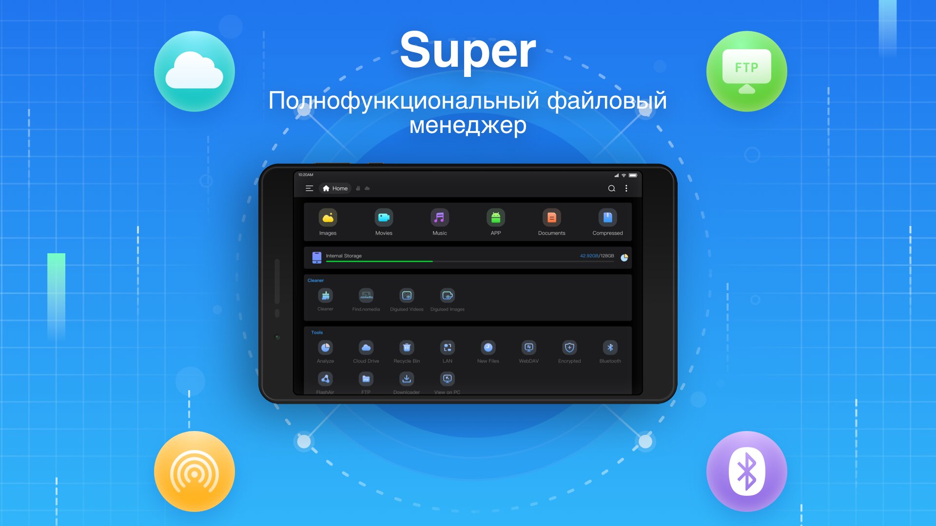 Super File Manager — это бесплатное, мощное и безопасное приложение для управления файлами на устройствах Android. Оно сочетает в себе удобный интерфейс и широкий набор функций для работы с локальными и сетевыми файлами. Приложение служит полноценным навигатором и контроллером для ваших файлов, предлагая такие важные инструменты, как панели быстрого доступа, анализаторы хранилища и очиститель в один клик, чтобы эффективно управлять пространством вашего устройства.