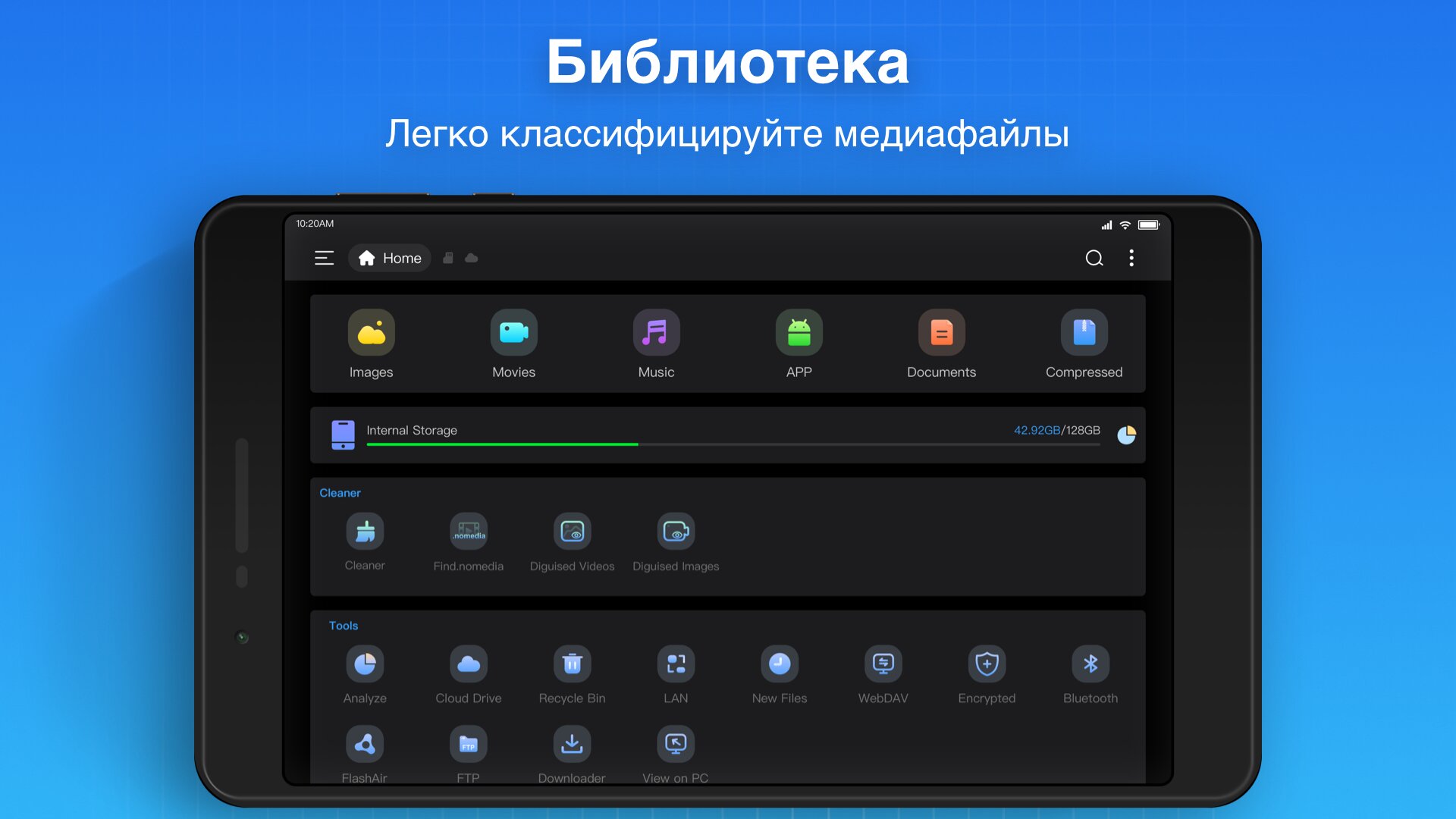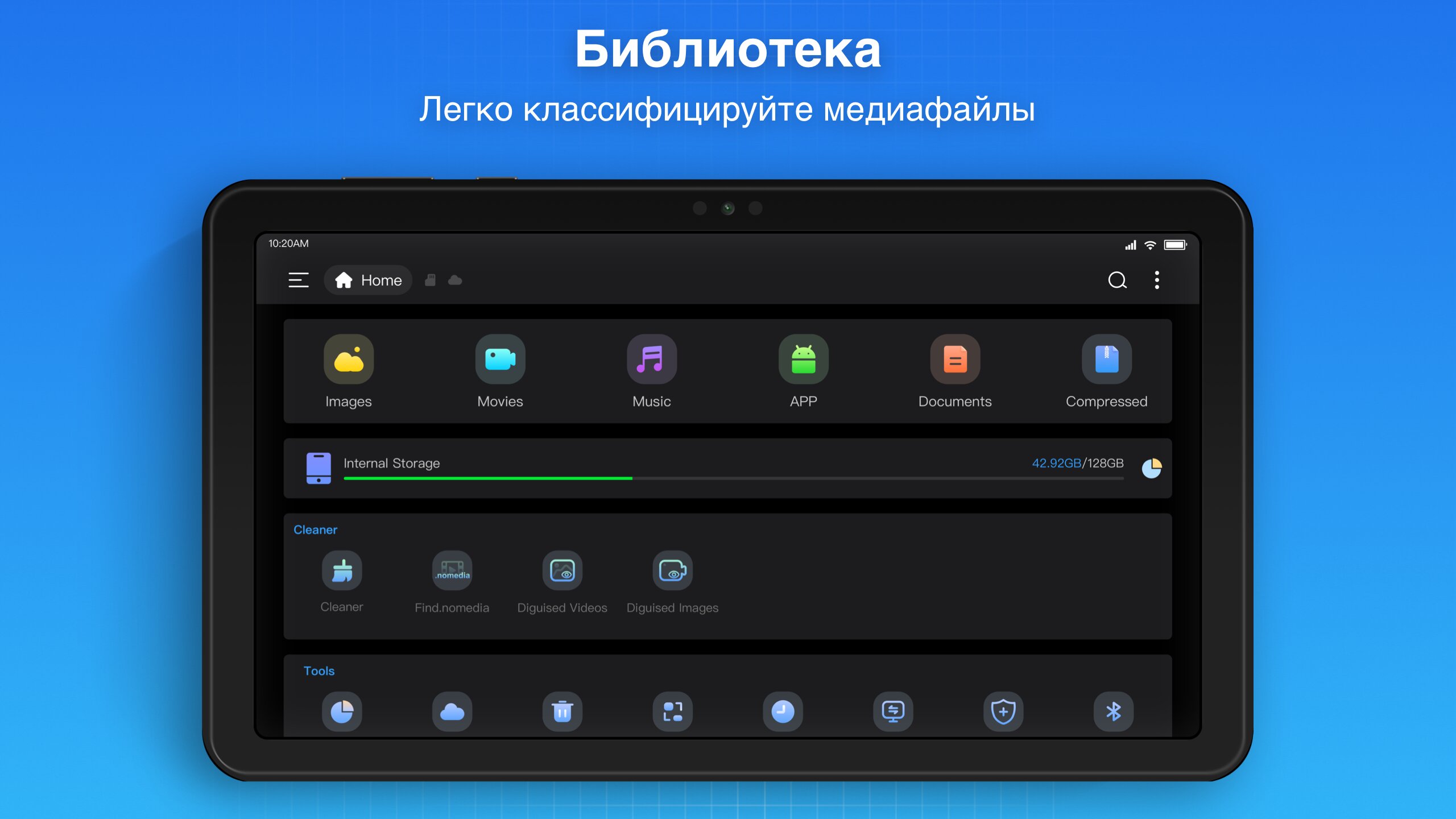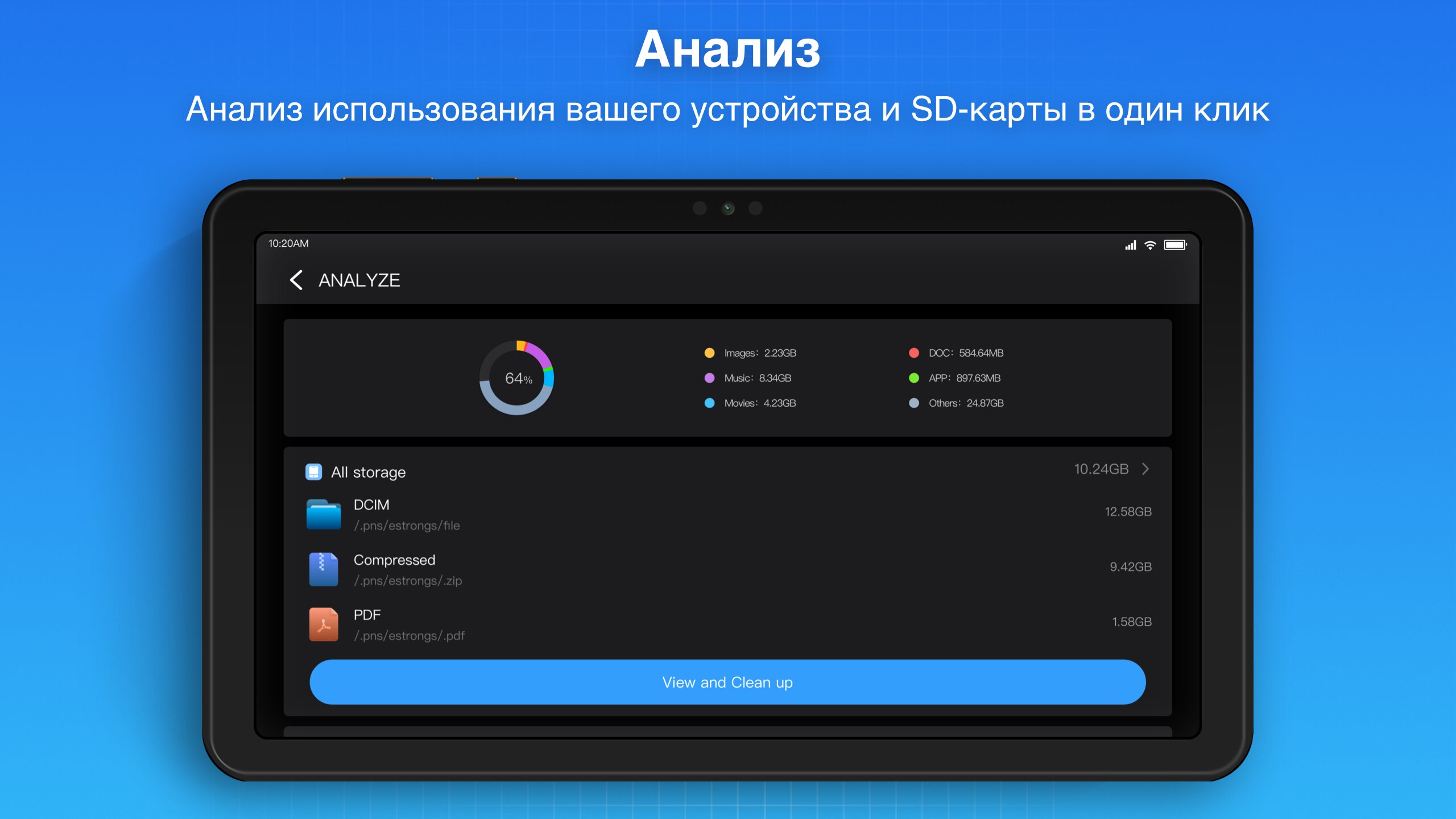 - Встроенный анализатор хранилища, поиск больших файлов и очистка мусора в один клик.