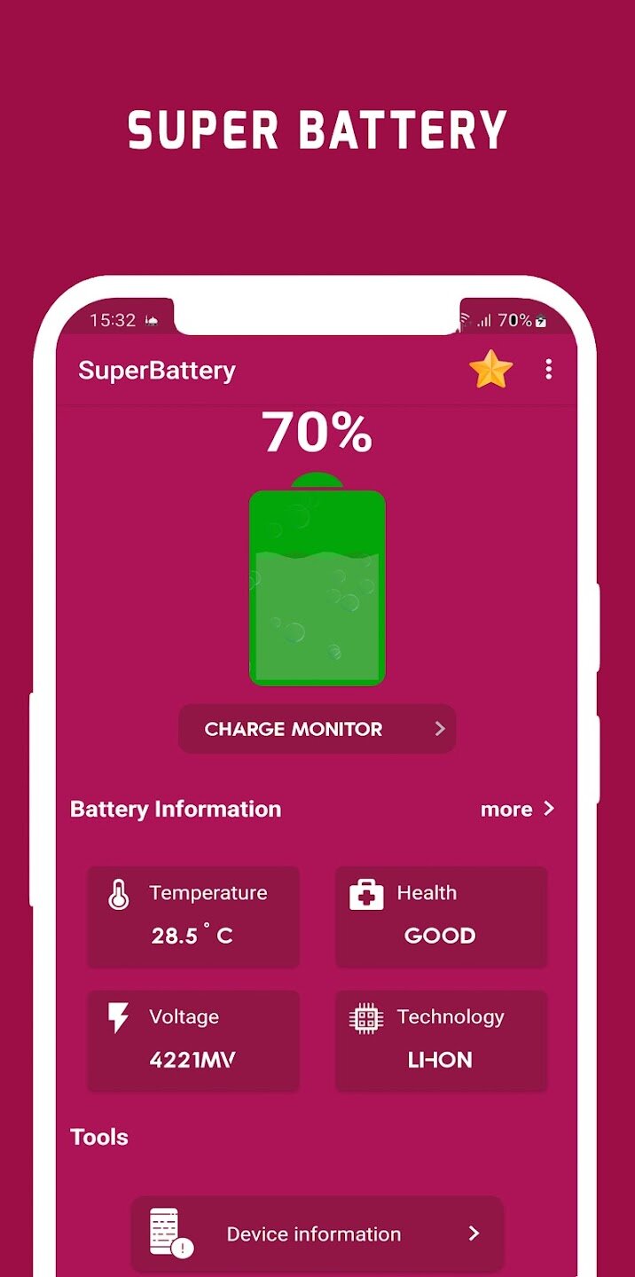 Superbattery & Charge Monitor — это практичное приложение для Android, разработанное для помощи в управлении состоянием батареи и процессом зарядки вашего смартфона. Это приложение предоставляет четкую информацию о состоянии батареи, улучшает процесс зарядки с помощью визуальных элементов и предлагает настраиваемые оповещения, чтобы вы могли полностью контролировать управление питанием вашего устройства, обеспечивая оптимальное состояние батареи.