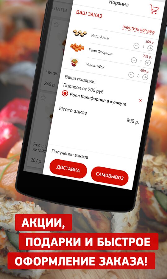 Теперь сделать заказ в Суши Wok еще проще! Более 350 позиций меню в твоем смартфоне, актуальные акции и специальные предложения, подарки и приятные сюрпризы – с новым приложением от сети магазинов Суши Wok ты сможешь заказывать любимые блюда по самым привлекательным ценам.