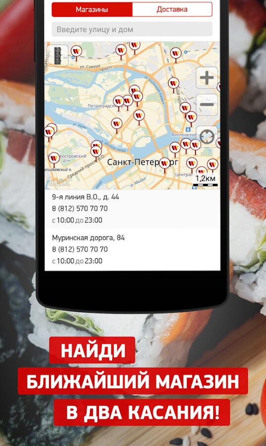 Проголодался? Карта подскажет тебе адрес ближайшего магазина, а удобная система оформления заказа в три клика позволит оформить самовывоз или доставку к указанному времени.