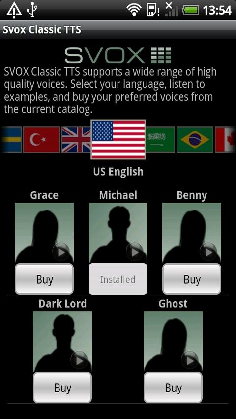 SVOX Classic Text To Speech Engine — Библиотека чтения текста голосом для других приложений.Голос женский и мужской (Катя и Юрий).По-русски читает очень даже хорошо по сравнению с TTS Service Extended.