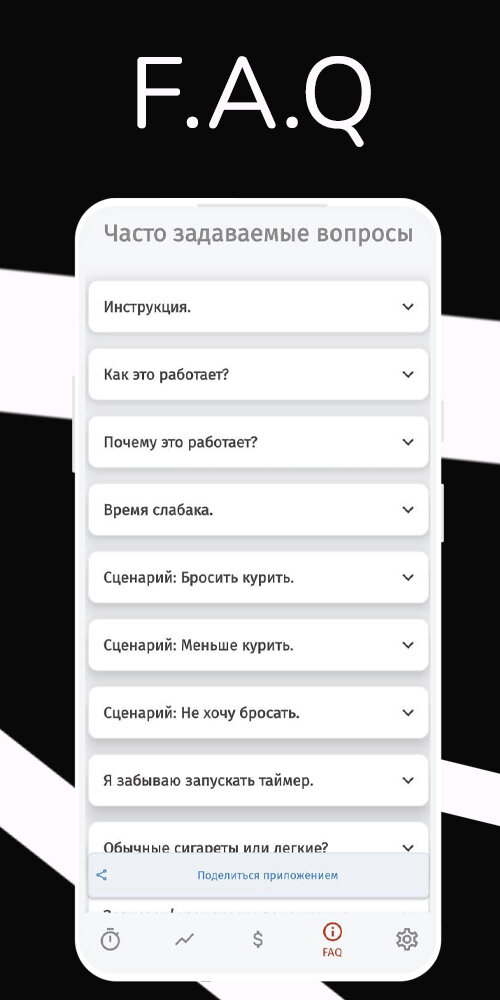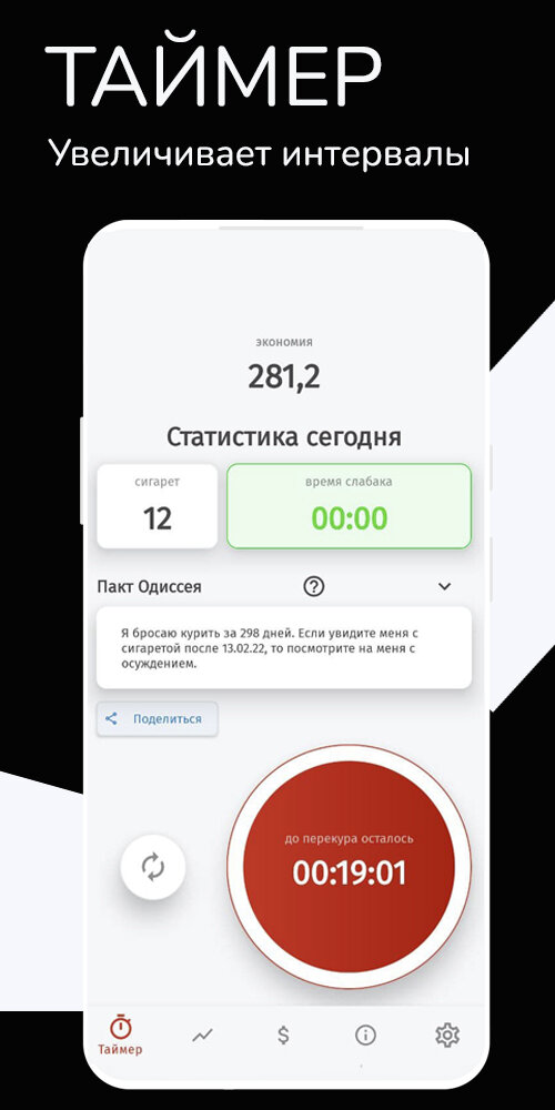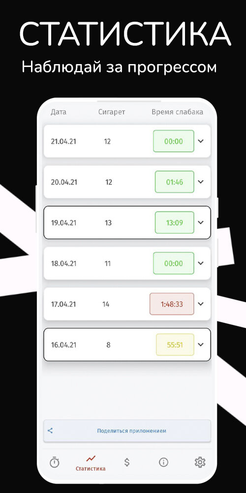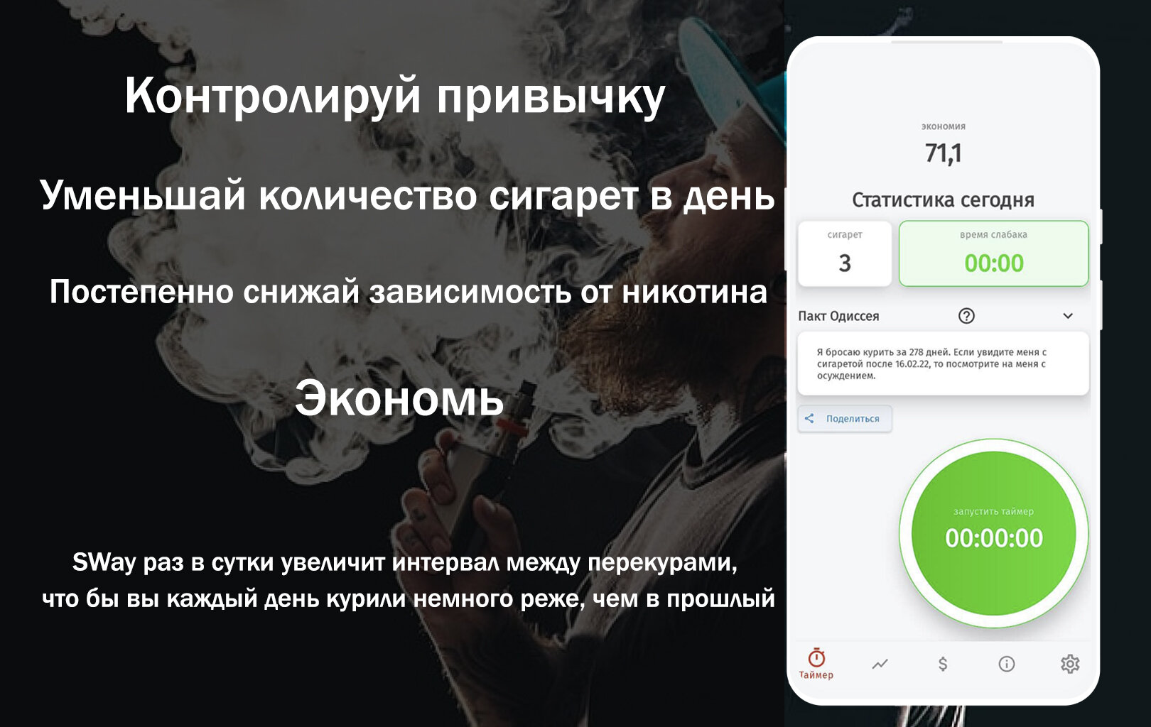 Очень важно создать себе полезную привычку пользоваться таймером и трекером. Приложение это воплощение метода и инструмент помощи вашему самоконтролю, а метод сработает только если у вас есть осознанное стремление избавится от вредной привычки или контролировать потребление сигарет.