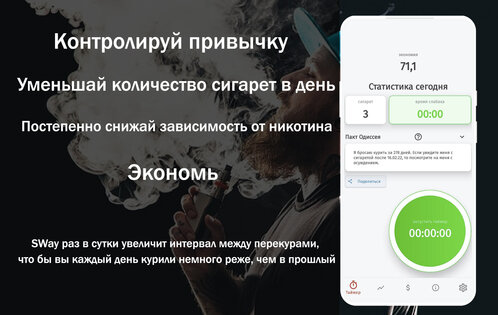 Приложение дисциплинирует вас и вы избавитесь от триггеров, которые заставляли вас тянуться к пачке сигарет.