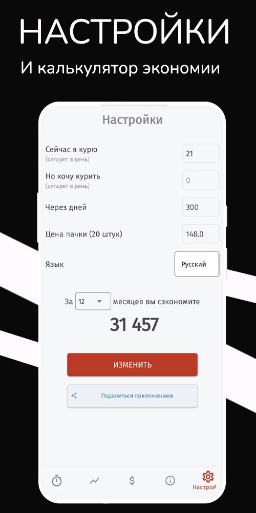 В настройки встроен калькулятор экономии, посмотрите сколько денег вы сэкономите в зависимости от того за сколько дней вы решите бросить курить.