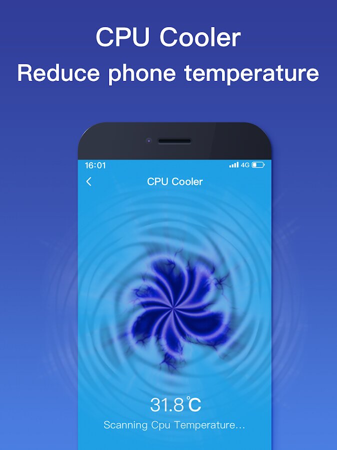 - Кулер процессора. Кулер ЦП отслеживает температуру системы в фоновом режиме и сканирует приложения, которые занимают высокие ЦП, если эффективно снижает температуру телефона. Благодаря CPU Cooler он максимально быстро охлаждает устройства Android.