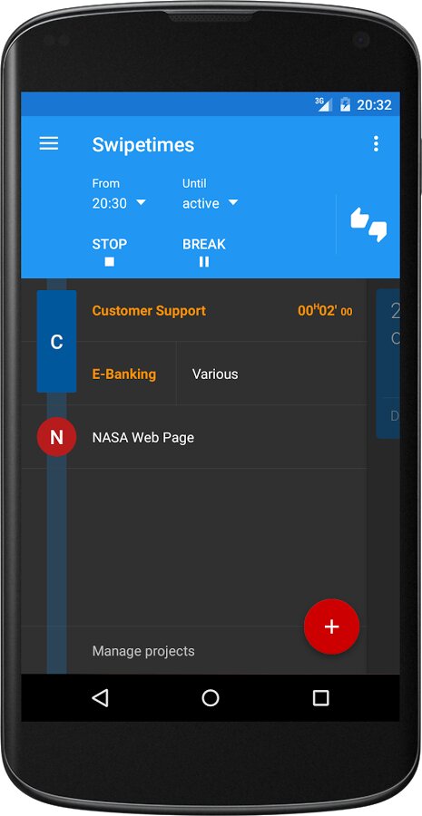 Swipetimes – замечательное приложение для деловых людей на андроид, с помощью которого можно вести учет времени. Swipetimes, является инновационным приложением с интуитивно понятным интерфейсом, которое позволяет проводить ряд следующих возможностей: определить проекты и задачи, проводить учет времени работы с помощью секундомера, просмотреть статистику в диаграмме, делать экспорт сохраненных записей в Excel, CSV или XML, а так же многое другое.
