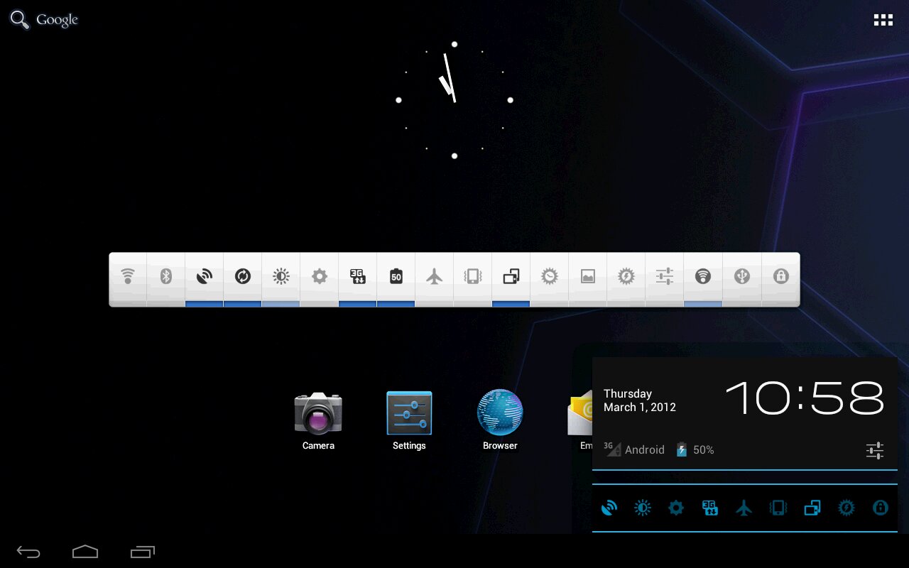 - Wi-Fi Bluetooth (Not Android 1.6) APN GPS (Shortcuts) Auto-sync (Not Android 1.6) Auto-Rotate Screen Brightness (30%->50%->100%->Auto) Screen Always On Silent Mode Airplane Mode Reload SD Card Vibration Mode 3G-2G (Shortcuts) Battery Indicator