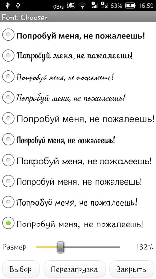Для установки шрифта выберите понравившийся шрифт из списка, затем нажмите "Выбор" и затем "Перезагрузка".