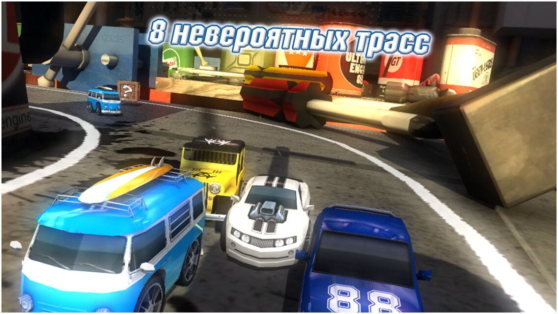 Table Top Racing — игра на Android, в которой вам предстоит гонять на маленьких автомобилях, a трассой вам будет служить кухонный стол с различными препятствиями в виде еды. На каждой машинке находится оружие для того чтобы разбивать препятствия и другие автомобили. Гоняйте на бешеной скорости, зарабатывайте монетки и улучшайте свой автомобиль и оружие.