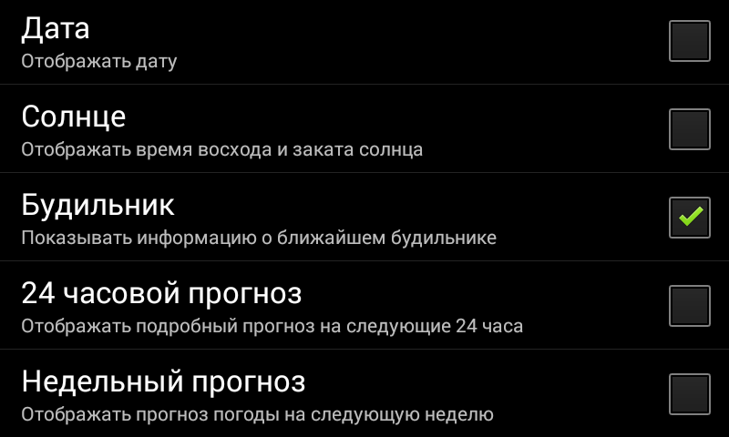 — отображение погоды сейчас, прогноз на сутки с шагом 6 часов, прогноз на следующую неделю: температура, скорость и направление ветра, давление, облачность, влажность, осадки и если небо чистое — фаза луны. Единицы температуры температуры скорости и давление — выбираются.