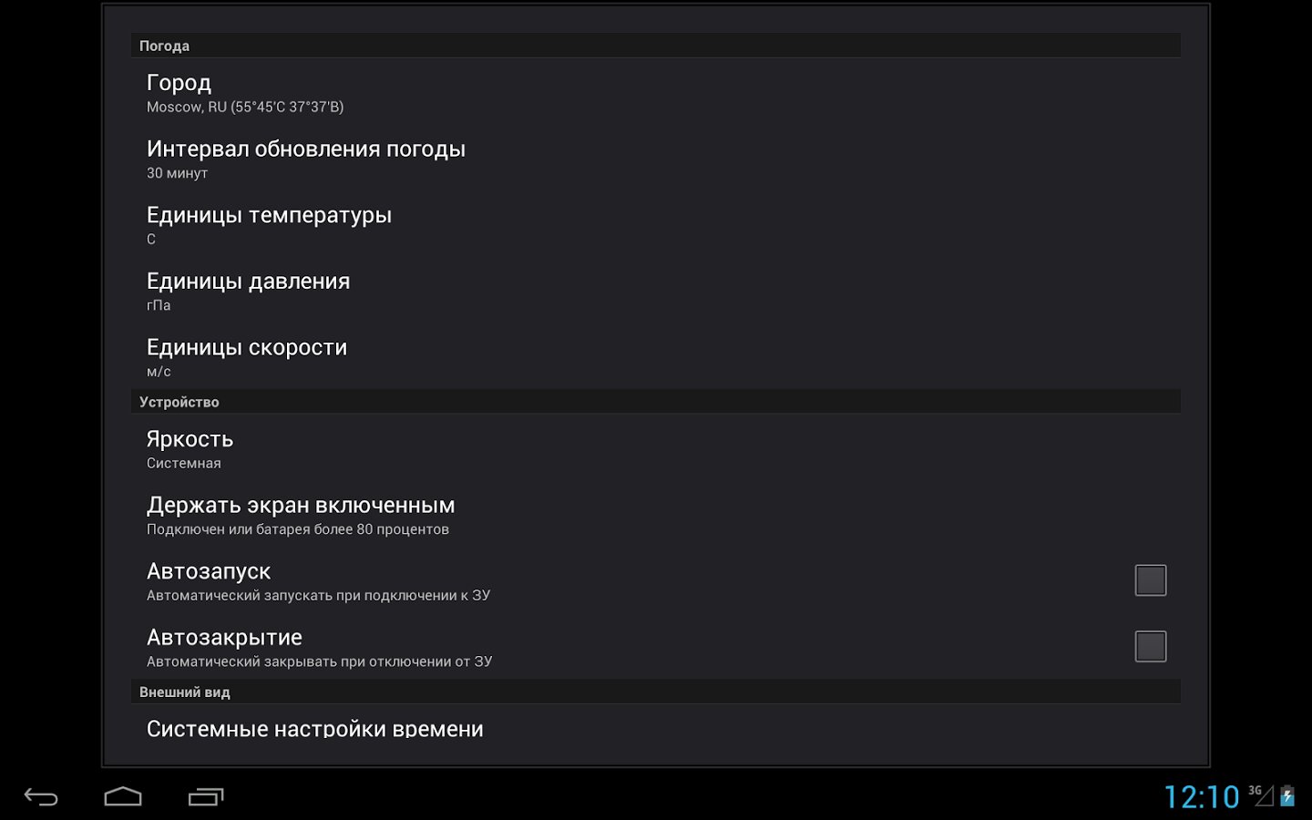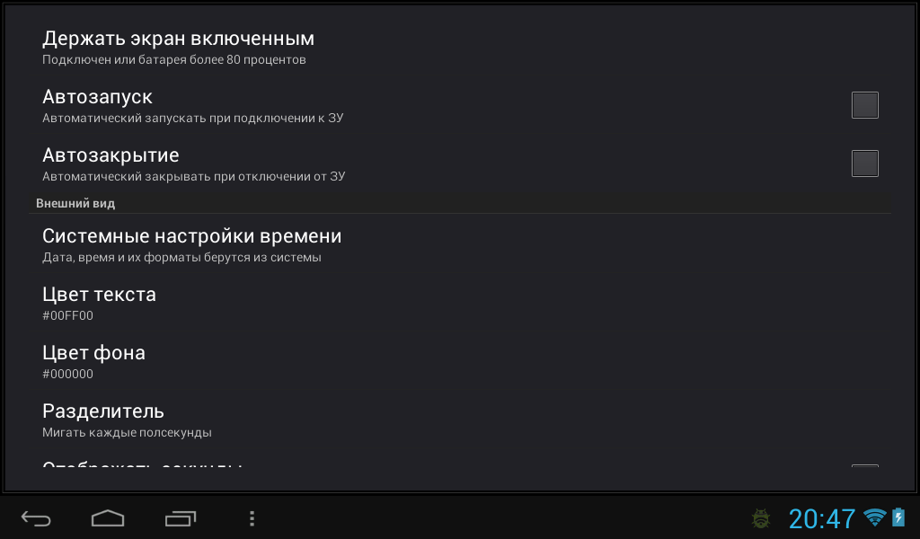 — возможность автоматического запуска и закрытия приложения при подключении и отключении от зарядного устройства (отключено в настройках по умолчанию)