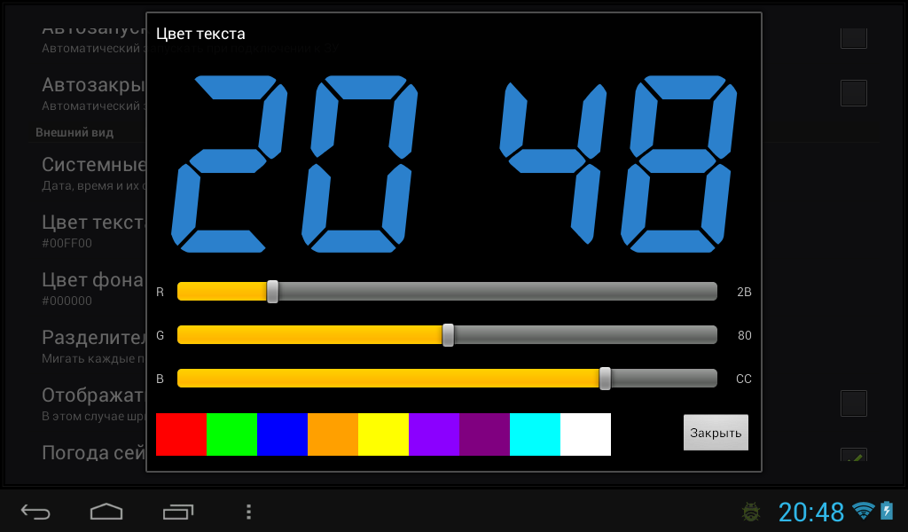 Если вы хотите уменьшить яркость еще меньше, чем позволяет ваше устройство, поменяйте в настройках цвета текста значения R, G, B на более низкие. Например если для зеленного(#00FF00) поставить 80 вместо FF яркость будет в 2 раза ниже.