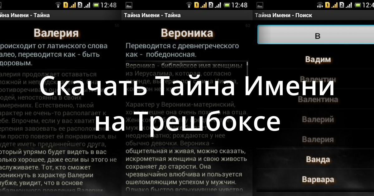 Тайна Имени — определяет характер человека по его имени. Каждое имя что-то значит. Для удобства человечество отказалось от уникальности первых имен «Острый Глаз», «Утренняя Заря». Однако все наши имена произошли от слов, имеющих свое значение.