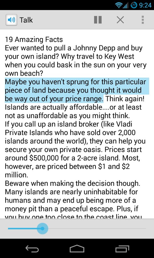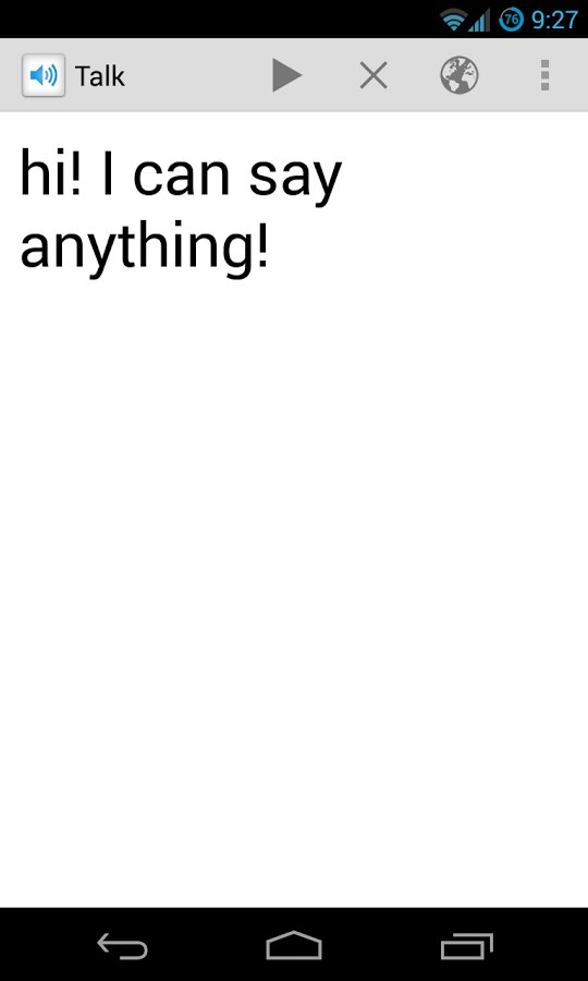 Talk — Text to Voice – программа для андроид от разработчика itsjoui способная преобразовывать текст в звуковой WAV файл, а именно в речь. Так что, если вы заняты и вам крайне необходимо знать о чем идет речь на веб-странице или в любом другом приложении, импортируйте выделенный текст и совмещайте оба занятия одновременно! Единственное Но, это то что ваше устройство должно быть оснащено двигателем преобразователя текста в речь. Приятного пользования!