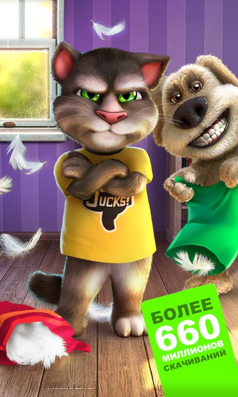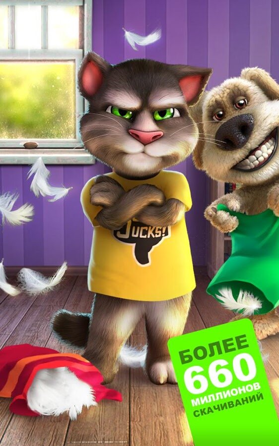 ✔ Нажми кнопку телефона, чтобы Том поиграл с оригинальным приложением «Говорящий Том» и повторял все за собой по забавной цепочке. ✔ Нажми кнопку перышка, чтобы увидеть, как Бен бьет Тома подушкой.