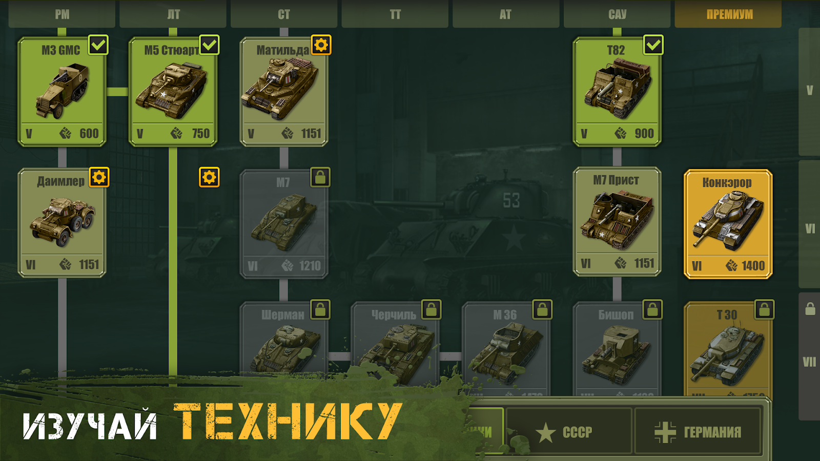 Начните военную карьеру с легкобронированных разведчиков, и развивайтесь до мощных тяжелых танков и гаубиц. Узрите мощь несокрушимого ИС-1, легендарного Тигра и разрушительного M109 своими глазами!