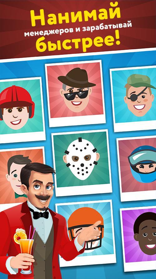 Тап-тап — и ты богат. Нет ничего проще, чем стать успешным инвестором. Начни свой путь на вершину мирового господства с продажи хот-догов, и ты даже не заметишь, как в твоей власти окажутся целые города! Чтобы справиться с таким объемом, тебе потребуются помощники. Нанимай менеджеров — они будут собирать прибыль даже когда ты занят другими делами.