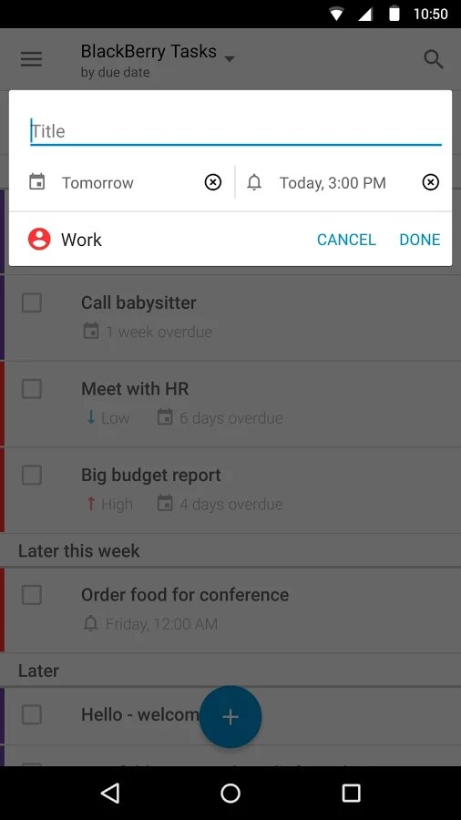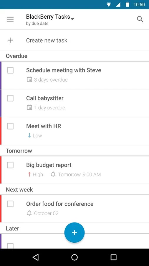 Задачи от BlackBerry — оптимизировано для ОС Android и предназначено для повышения производительности. Оно обеспечивает удобную синхронизацию задач пользователя с сервером Microsoft Exchange с помощью Microsoft Exchange ActiveSync.