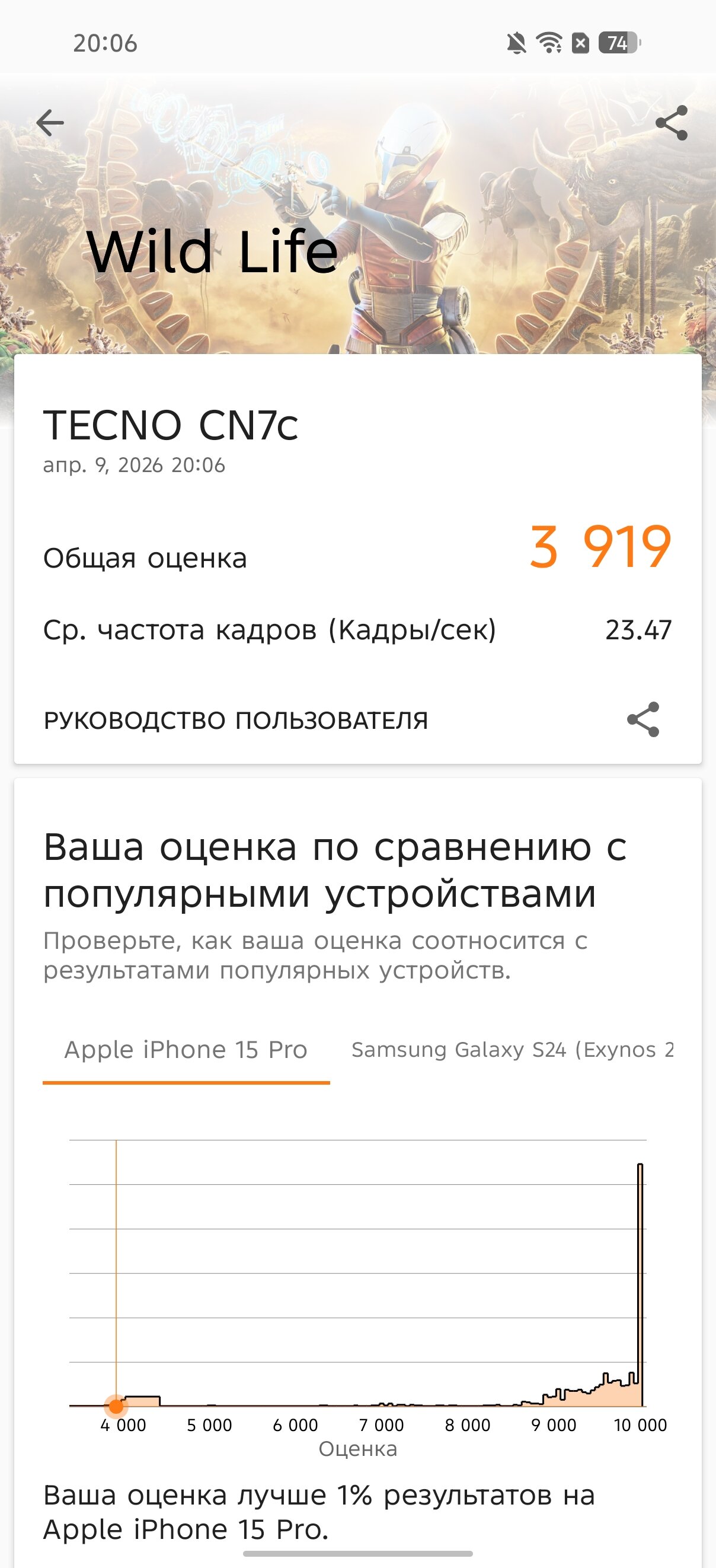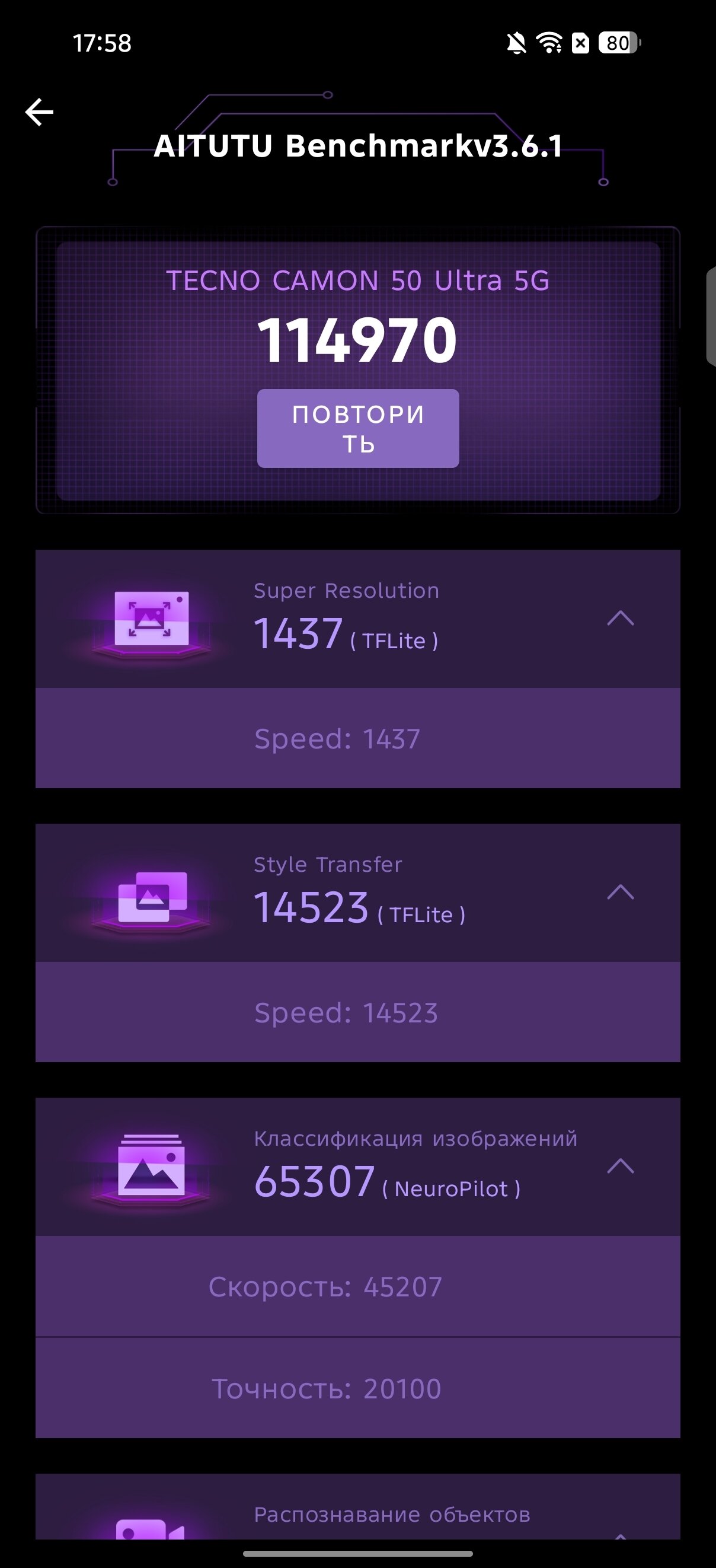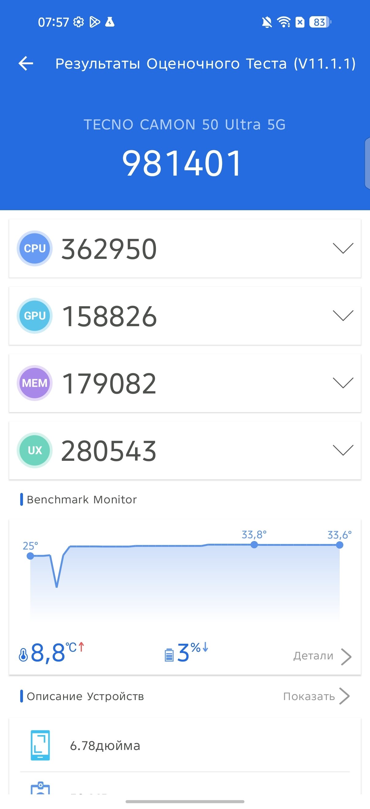 Давайте закончим с теорией и перейдём к практике. В бенчмарках TECNO CAMON 50 Ultra 5G показывает достойный результат по меркам своего сегмента, причём это касается как сугубо процессорных, так и графических тестов, и комплексных. Если перефразировать, герой обзора не отстаёт от конкурентов, но и не оставляет их позади.