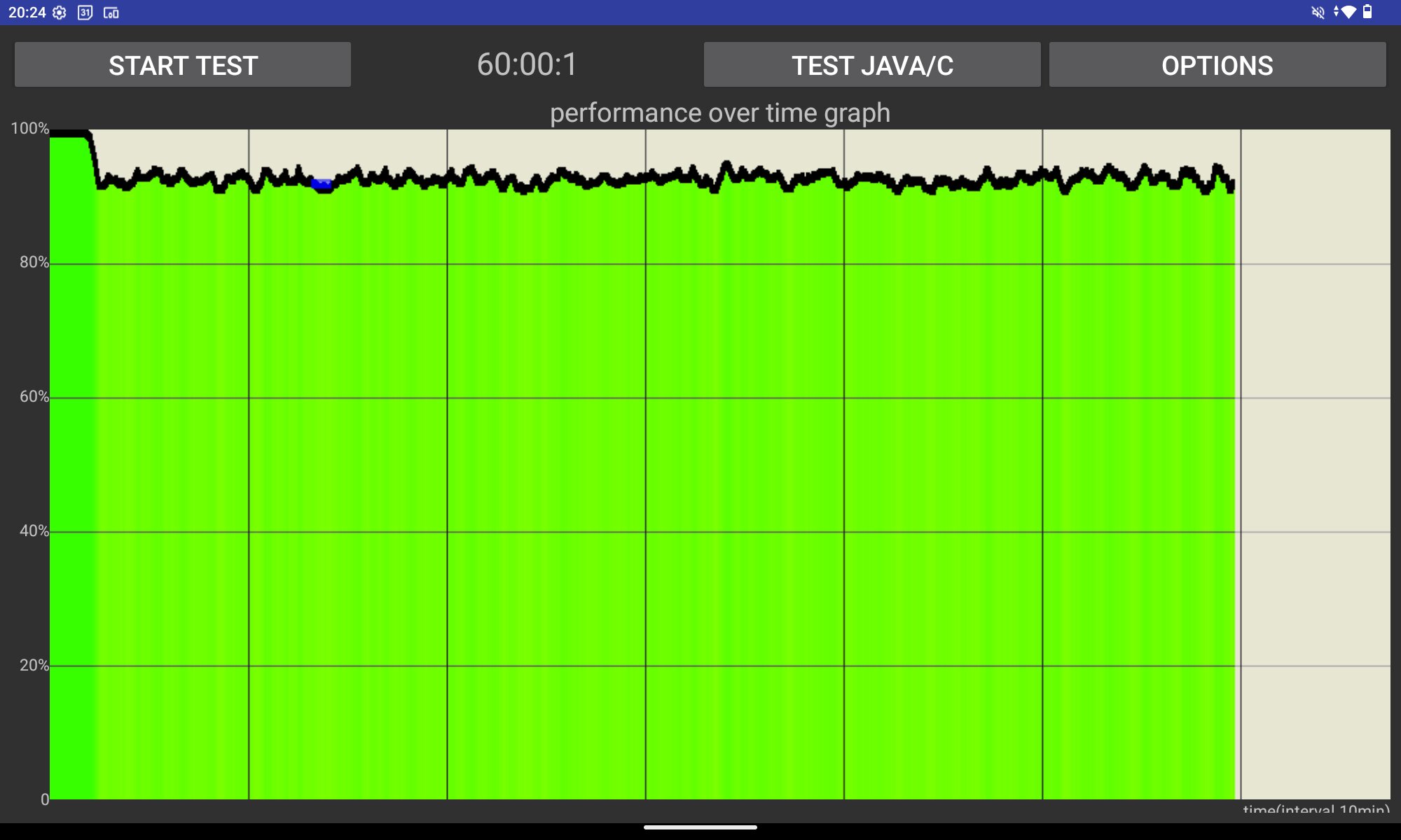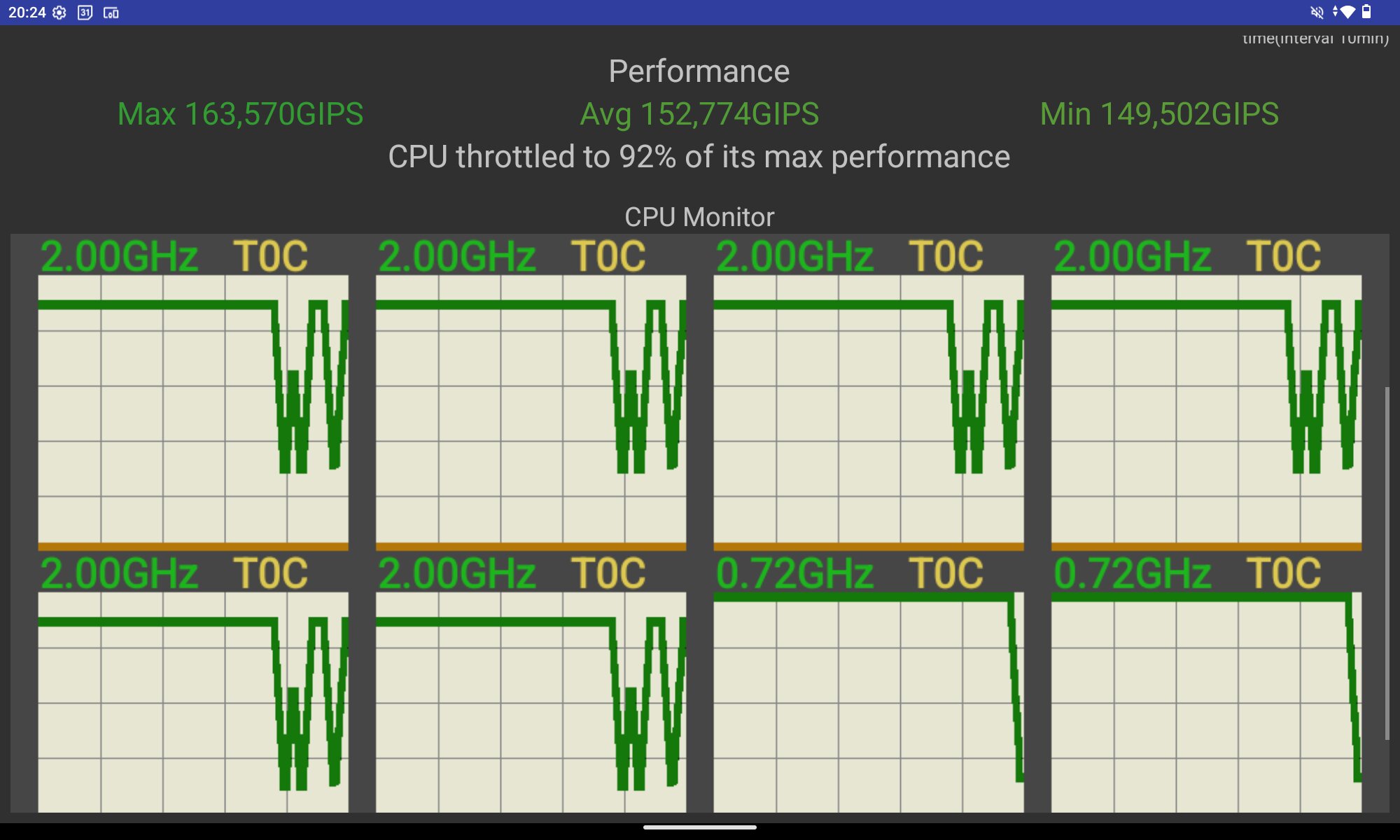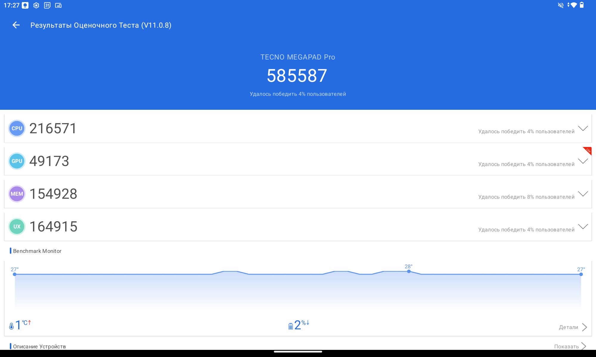 Результаты в бенчмарках показывают, что производитель полностью раскрыл потенциал Helio G100, то есть у планшета нет каких-либо проблем с оптимизацией или перегревом. Это подтверждает и стресс-тест: процессор сбрасывает всего 8% производительности, а графика — 5%.