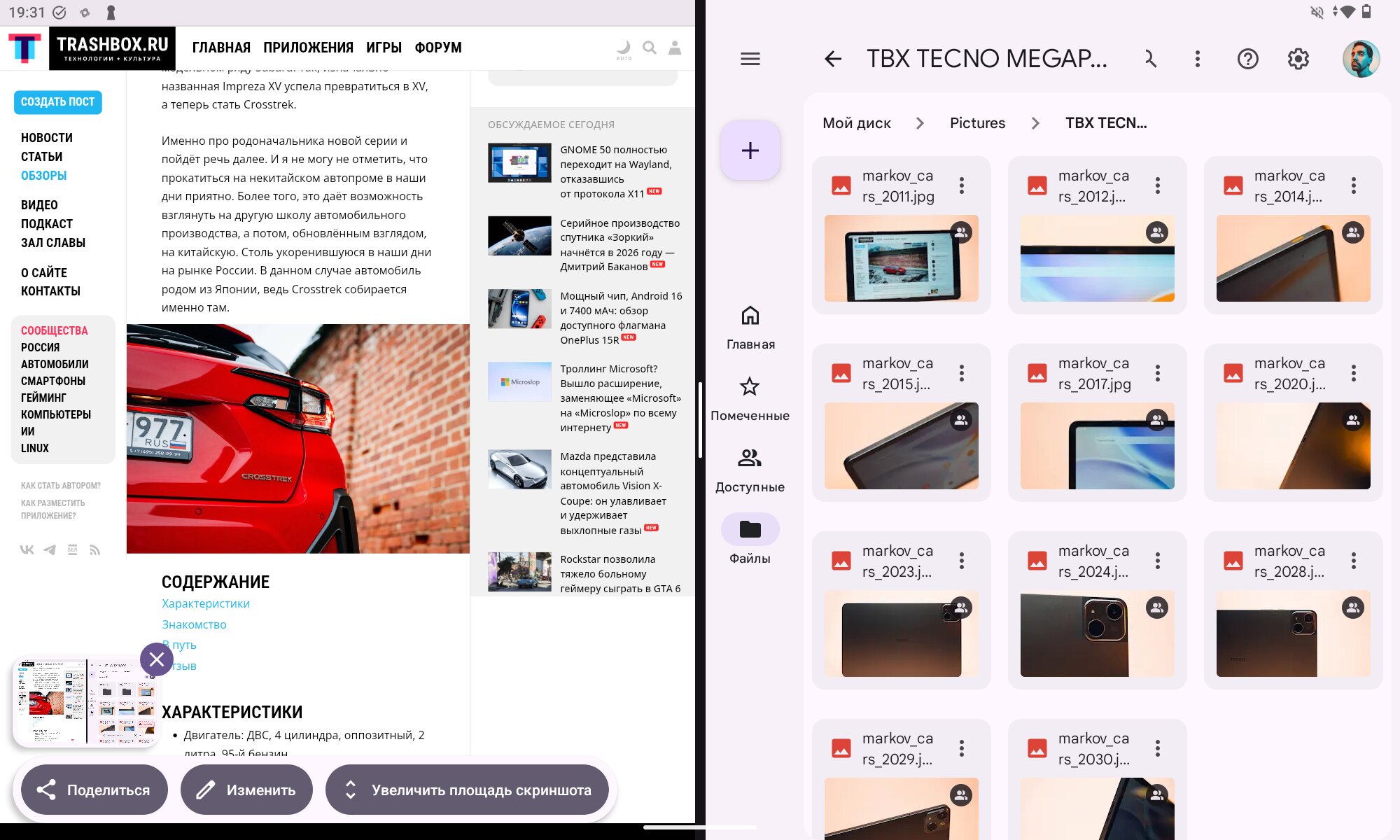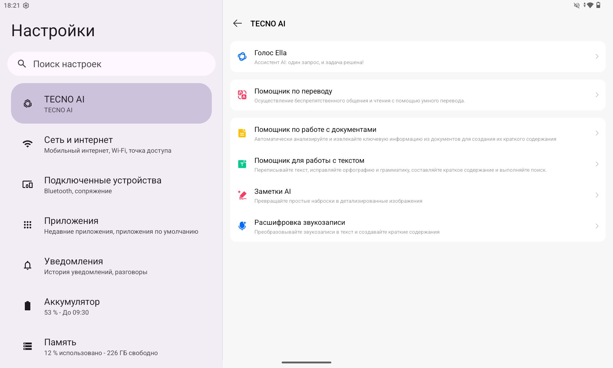 Прошивка TECNO MEGAPAD Pro основана на Android 15, и она полностью оптимизирована под планшеты: можно разделить экран на две части, меняя их пропорции по мере использования, а также использовать плавающие мини-окна (я часто открывал так калькулятор поверх статей в интернете и мессенджера). Если сопрягать с героем обзора другие устройства TECNO, их получится использовать в единой экосистеме со связанными функциями: например, легко передавать файлы без проводов, использовать планшет как дополнительный экран для ноутбука или транслировать дисплей смартфона на MEGAPAD Pro.