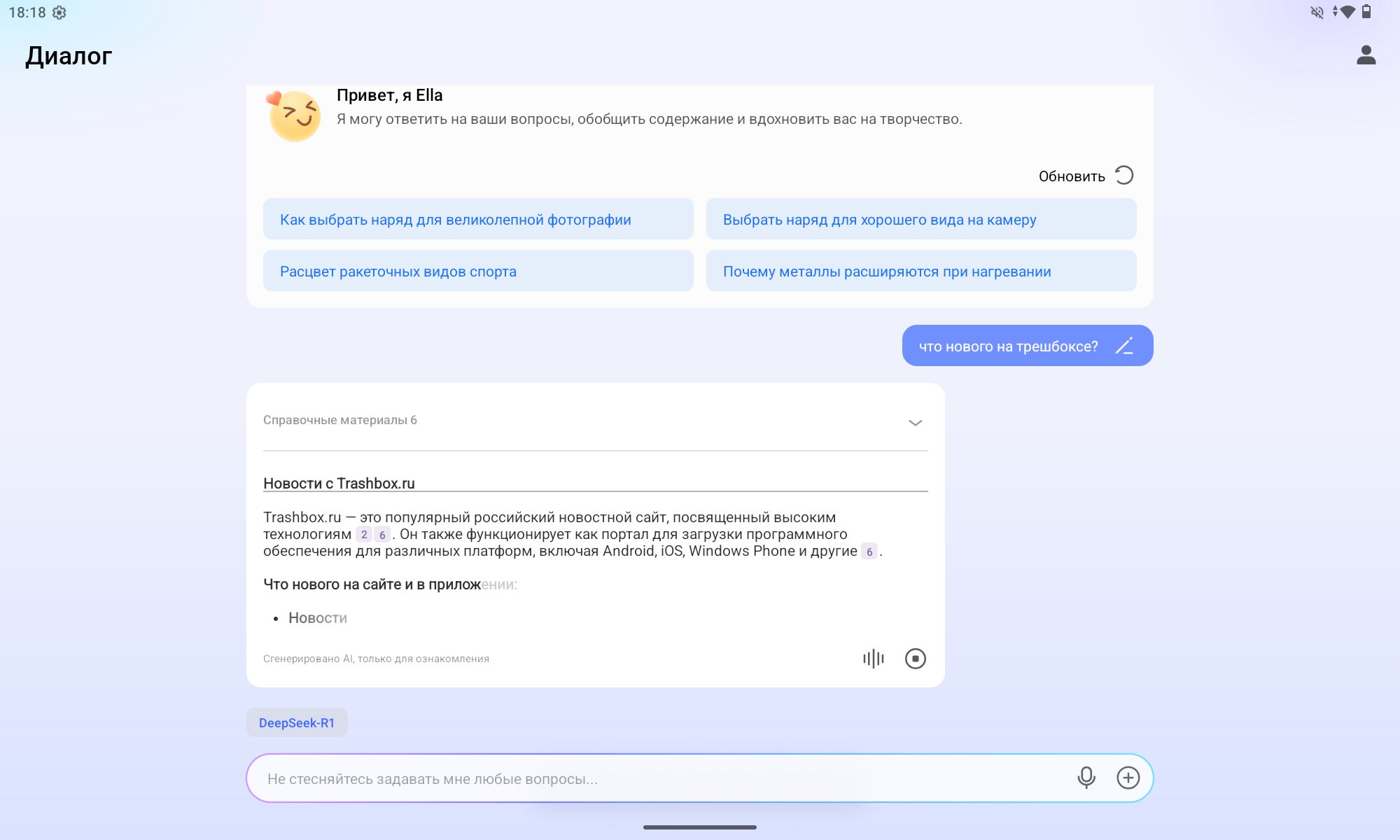 Причём ИИ поддерживает даже цепочки действий: например, можно извлечь текст из фотографии и сразу поместить его в файл формата PDF, Word или Excel (просто «умное сканирование» расположено в панели управления). При желании к Ella можно подключить популярный искусственный интеллект DeepSeek, причём в лице рассуждающей модели R1 — делается это нажатием кнопки над текстовым полем.