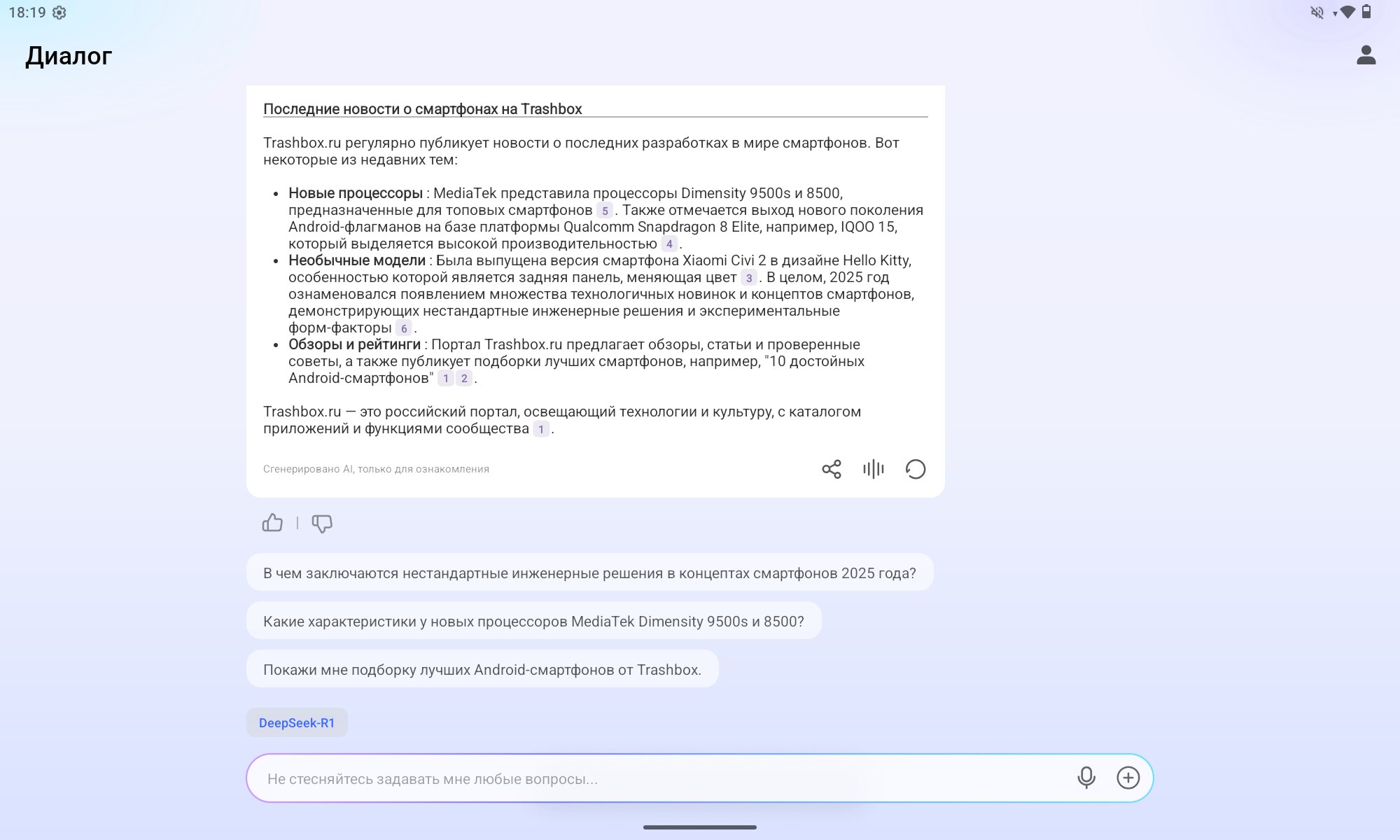 Отдельно ещё раз отмечу прошивку со встроенным интеллектом и подключаемым DeepSeek-R1 — нейросети тесно интегрированы в те или иные участки операционной системы и в виртуального помощника, и ими действительно удобно пользоваться, особенно благодаря наличию отдельной физической кнопки на корпусе.