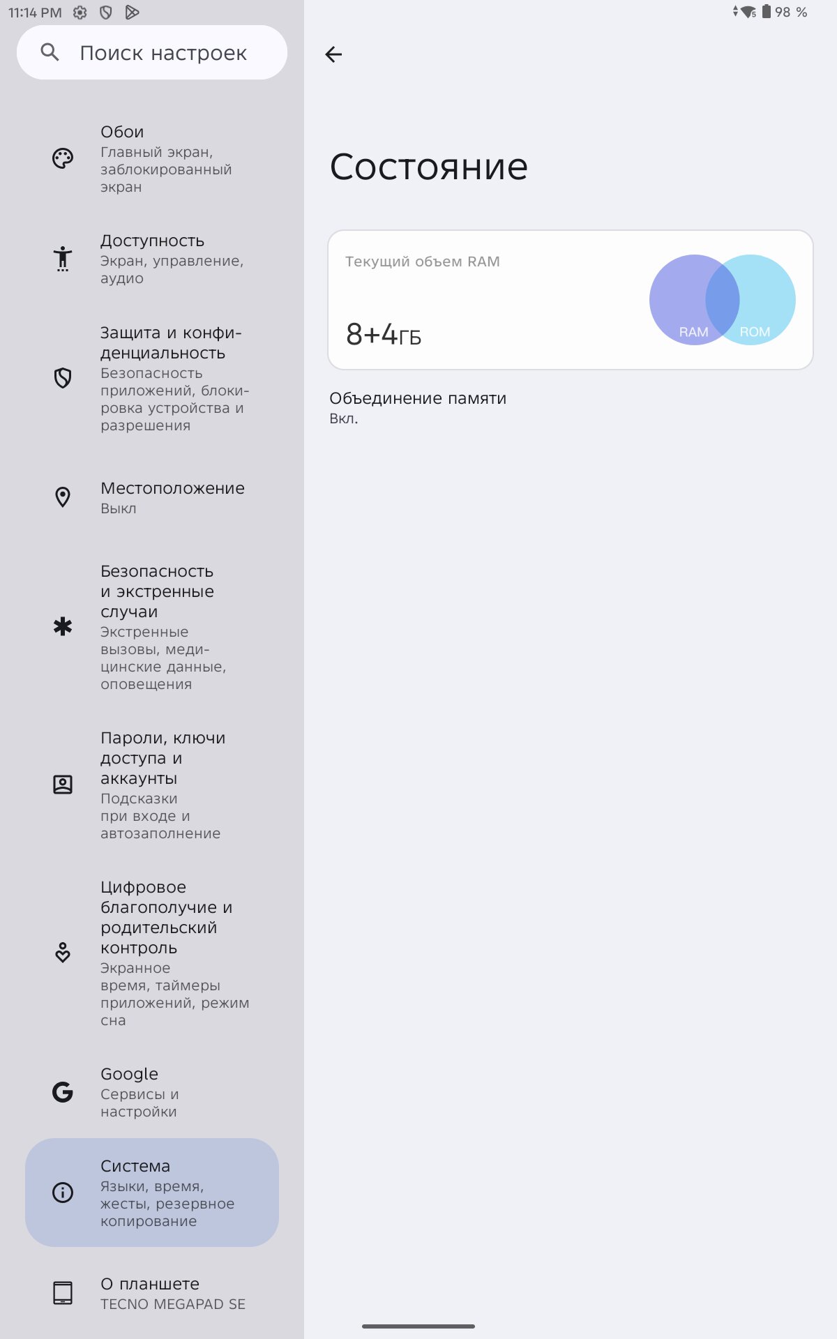 Более того, экран планшета может похвастаться частотой обновления 90 Гц — безусловно, по нынешним меркам это далеко не рекорд, но, с другой стороны, перед вами планшет из доступного ценового сегмента, где многие модели выпускаются с 60 Гц, так что повышенную плавность я бы всё же отнёс к плюсам Tecno MegaPad SE. Листать ленту социальных сетей, страницы в интернете или просто взаимодействовать с пользовательским интерфейсом планшета гораздо приятнее, анимации ощущаются плавными, глаза в течение дня устают заметно меньше. И, конечно, после 90 Гц откатываться на 60 Гц вы точно не захотите.