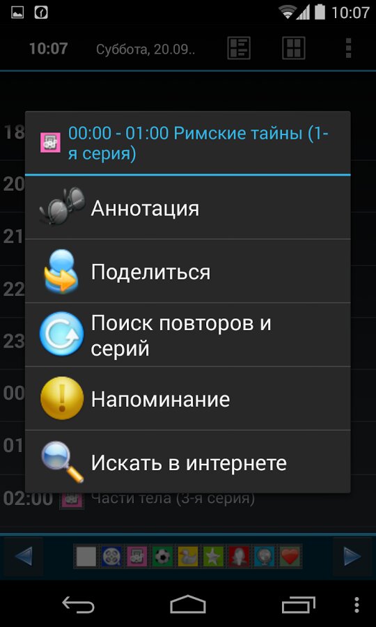 - Кнопка поделиться, позволяет отправлять выбранную передачу по СМС, емайлу, в твиттер и другие сторонние приложения;