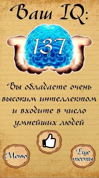 В нашем приложении множество разнообразных тестов. Наш тест на IQ является самым точным в интернете. Кроме теста на ваши умственные способности вы можете пройти множество других тестов. Тест на тип памяти поможет вам выявить каким образом вам легче всего будет запоминать информацию. Данный тест будет крайне полезен школьникам и студентам, которые получают огромный поток информации. Вы сможете сдать тест на склад ума и свойства ума. Это поможет вам понять гуманитарий вы или технарь. Крайне интересен тест на интуицию. Сдав его, вы поймете стоит ли слушать внутренний голос или руководствоваться только разумом. Также вы сможете выявить в какой сфере у вас талант, пройдите тест на творческий потенциал личности. Если вы еще не знаете, чего боитесь больше всего, то вам поможет в этом тест на страхи и фобии. Ведь чтобы бороться со страхом надо знать, чего вы боитесь.