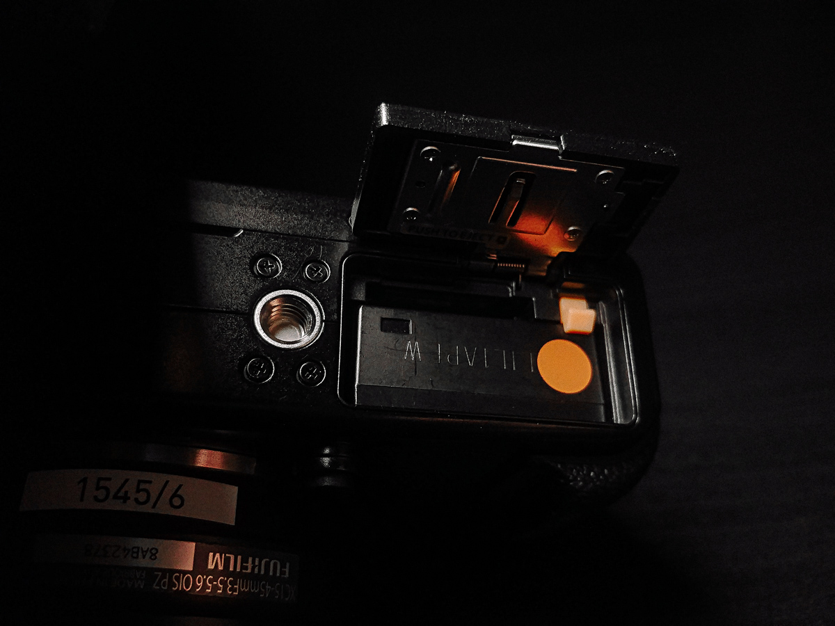 Снизу находится стандартная резьба под штативную площадку. Под крышкой находится слот под SD-карту и аккумулятор. К вопросу запаса энергии мы ещё вернёмся в блоке про использование, но можем сказать, что в целом его хватает на день. Fujifilm заявляет, что запас на 430 снимков. Прибавьте к этому, тот факт, что камера заряжается от внешнего аккумулятора и можно сделать заключение, что разрядившийся аккумулятор не будет проблемой.