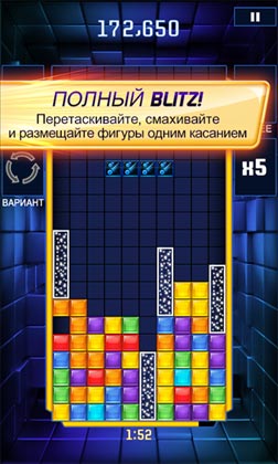 Новая, улучшенная и современная игра Tetris Blitz теперь для Вас. Вас ждут бонусы, с помощью которых Вы сможете выполнять тяжелые задания, а появляющиеся новые бонусы внесут разнообразие в игру. Ураганный режим поможет набрать очков в два раза больше, при этом нужно взрывать фигуры. Для того, чтобы удержаться в ураганном режиме как можно дольше, Вам нужно расчистить как можно больше линий и тогда огромное количество очков Вам обеспечено. Усовершенствуя свои навыки, Вы сможете подняться на самый верх в таблице лидеров и покрасоваться перед друзьями в Facebook*. Попробуйте и Вам обязательно понравится.